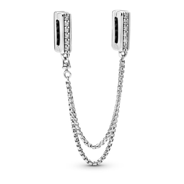 Mieniący się łańcuszek zabezpieczający z klipsami sprawi, że nigdy nie zgubisz swojej bransoletki Pandora Reflexions. Opadające mieniącą się kaskadą łańcuszki i misterne zdobienia klipsów sprawiają, że ten dodatek nie ma sobie równych. Klipsy po jeden stronie są ozdobione 12 cyrkoniami sześciennymi, a po drugiej – logo Pandora. Zależnie od nastroju możesz je odwrócić i dopasować do różnych stylizacji.