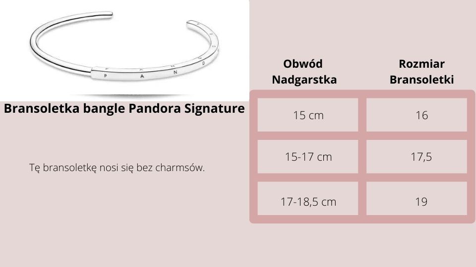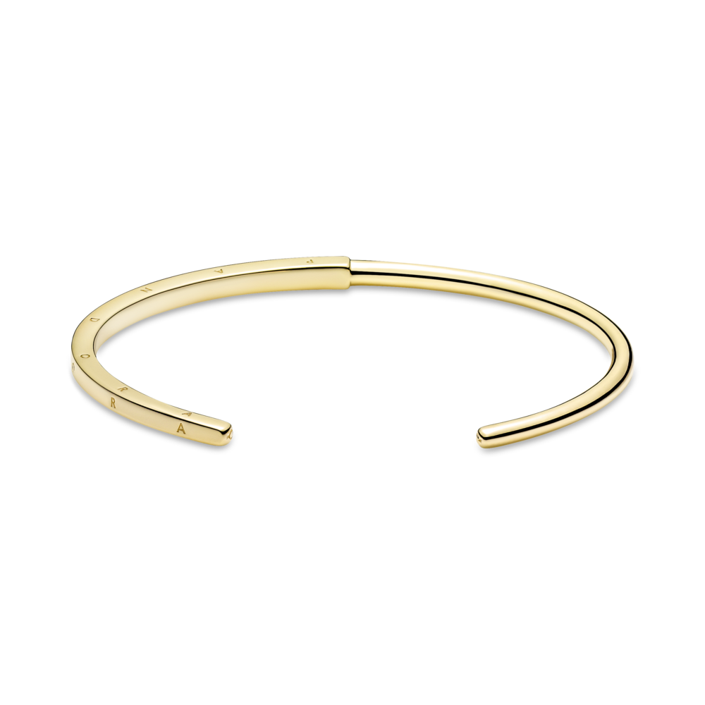 Najlepszy dowód na to, że prostota może robić potężne wrażenie. Pół kwadratowa, pół okrągła bransoletka bangle jest platerowana 14-karatowym złotem. Okrągły polerowany profil zmienia pośrodku bransoletki kształt na kwadratowy, z logo Pandora biegnącym wzdłuż trzech widocznych krawędzi. Obie końcówki zostały ozdobione monogramem Pandora z O w koronie. Bransoletki nie można zginać ani zaciskać – jej rozmiar został dopasowany tak, by optymalnie leżała na nadgarstku.