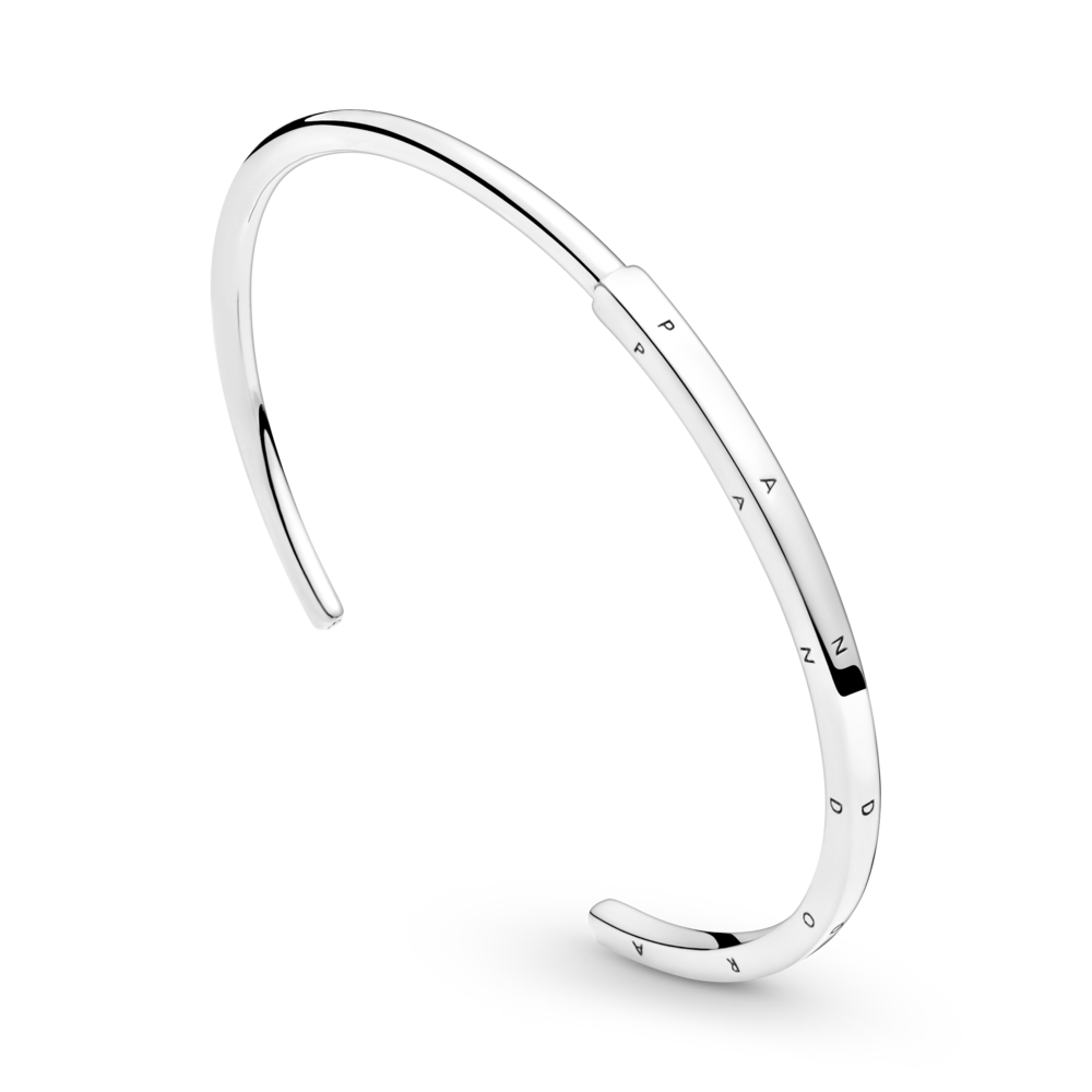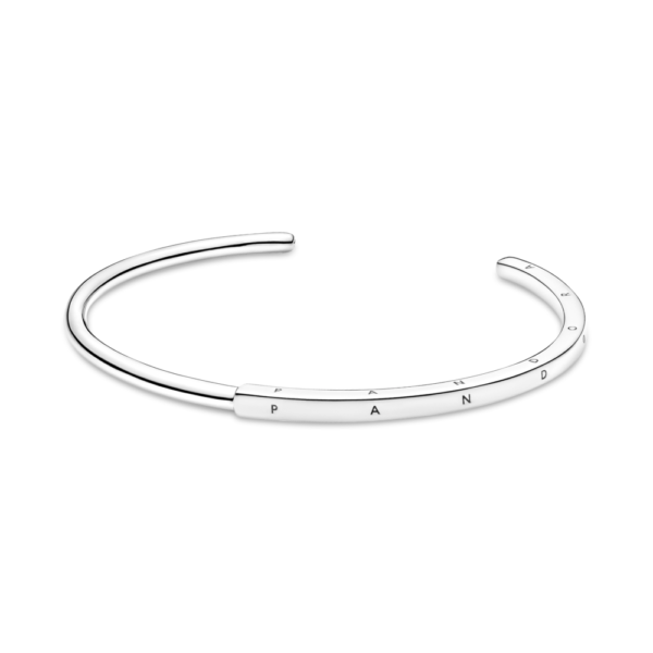 Najlepszy dowód na to, że prostota może robić potężne wrażenie. Pół kwadratowa, pół okrągła bransoletka bangle została wykończona ręcznie ze srebra. Okrągły polerowany profil zmienia pośrodku bransoletki kształt na kwadratowy, z logo Pandora biegnącym wzdłuż trzech widocznych krawędzi. Obie końcówki zostały ozdobione monogramem Pandora z „O” w koronie. Bransoletki nie można zginać ani zaciskać – jej rozmiar został dopasowany tak, by optymalnie leżała na nadgarstku.