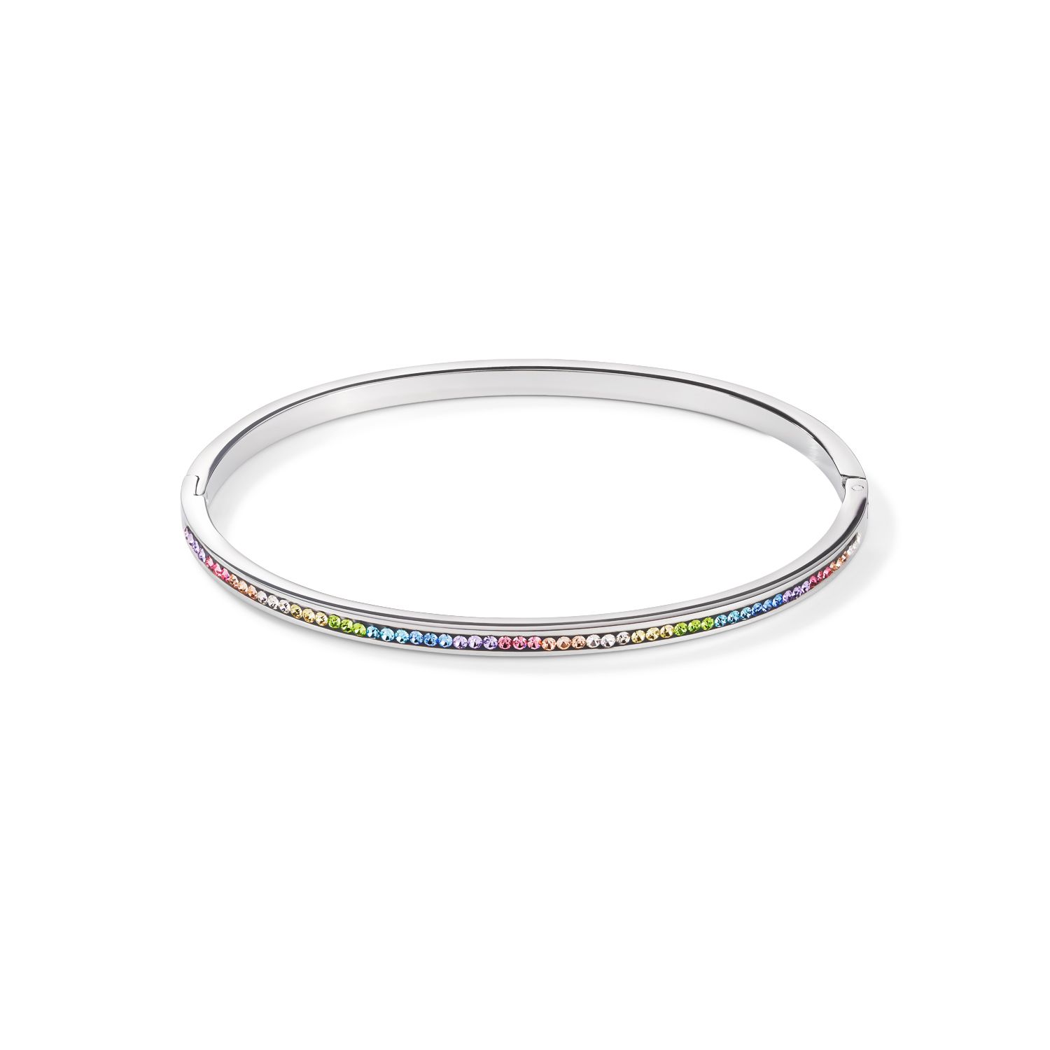 Drobna, delikatna, elegancka: sztywna bransoletka COEUR DE LION wypełniona pastelowymi wielokolorowymi kryształami w oprawie pavé, w całości wykonana ze stali szlachetnej pokrywana złotem.