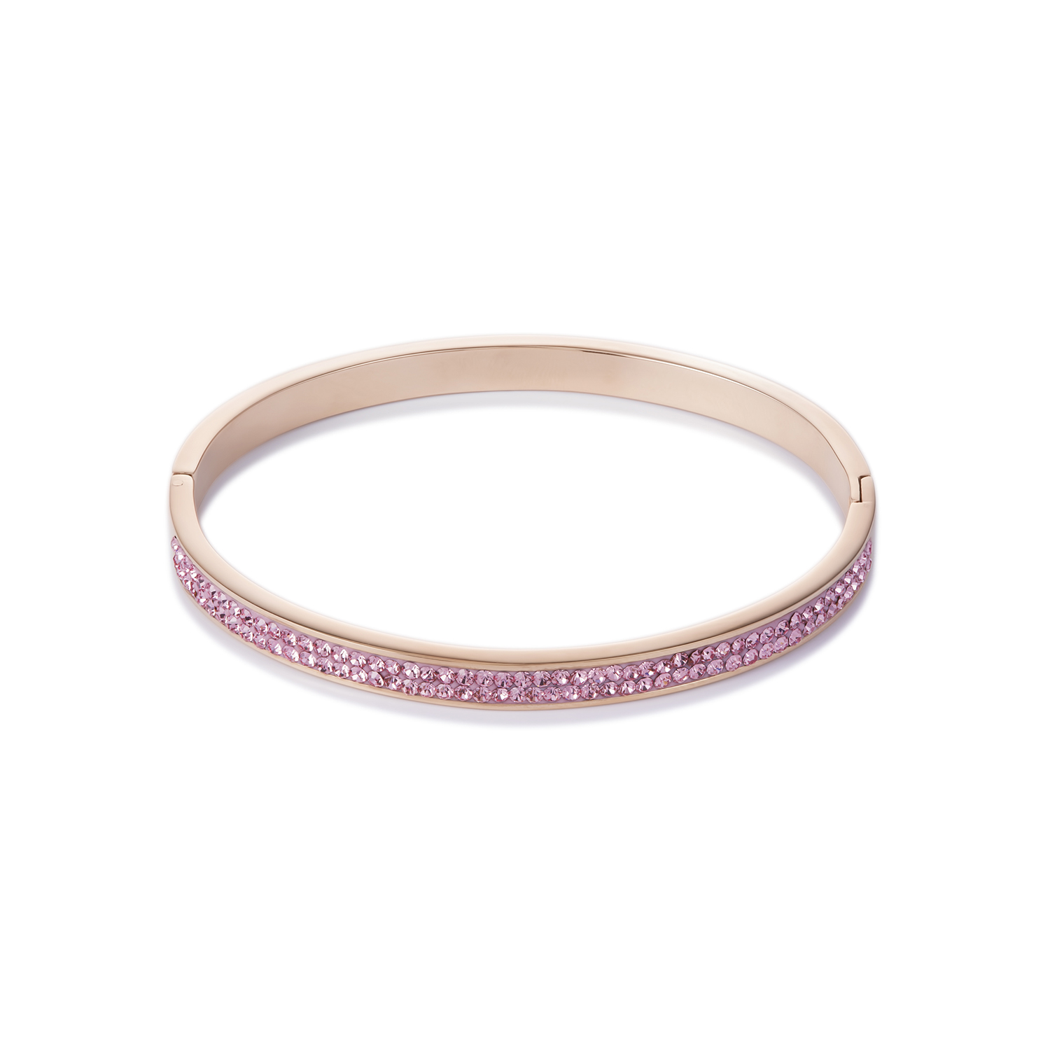Elegancka bransoletka bangle z błyszczącymi kryształkami w oprawie pavé i zintegrowanym zapięciem na zatrzask, wykonana ze stali szlachetnej pokrywanej różowym złotem.