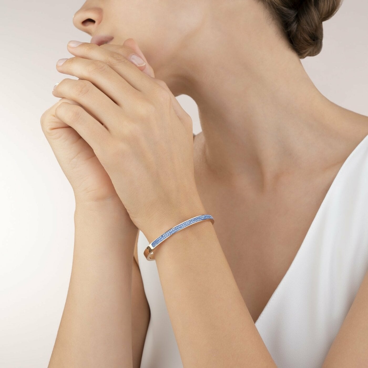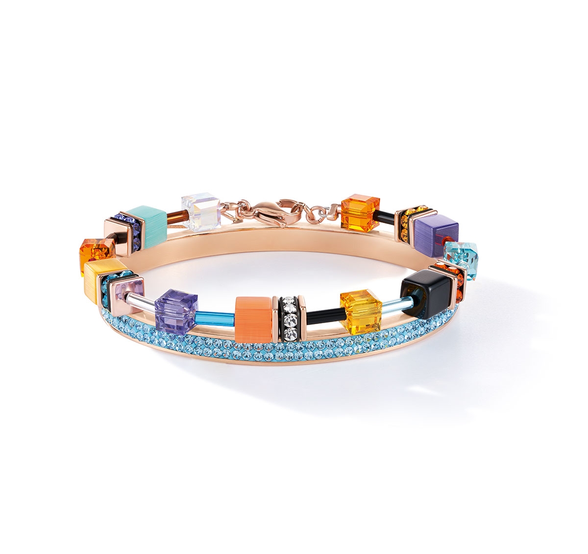 Elegancka bransoletka bangle z błyszczącymi kryształkami w oprawie pavé i zintegrowanym zapięciem na zatrzask, wykonana ze stali szlachetnej pokrywanej różowym złotem.