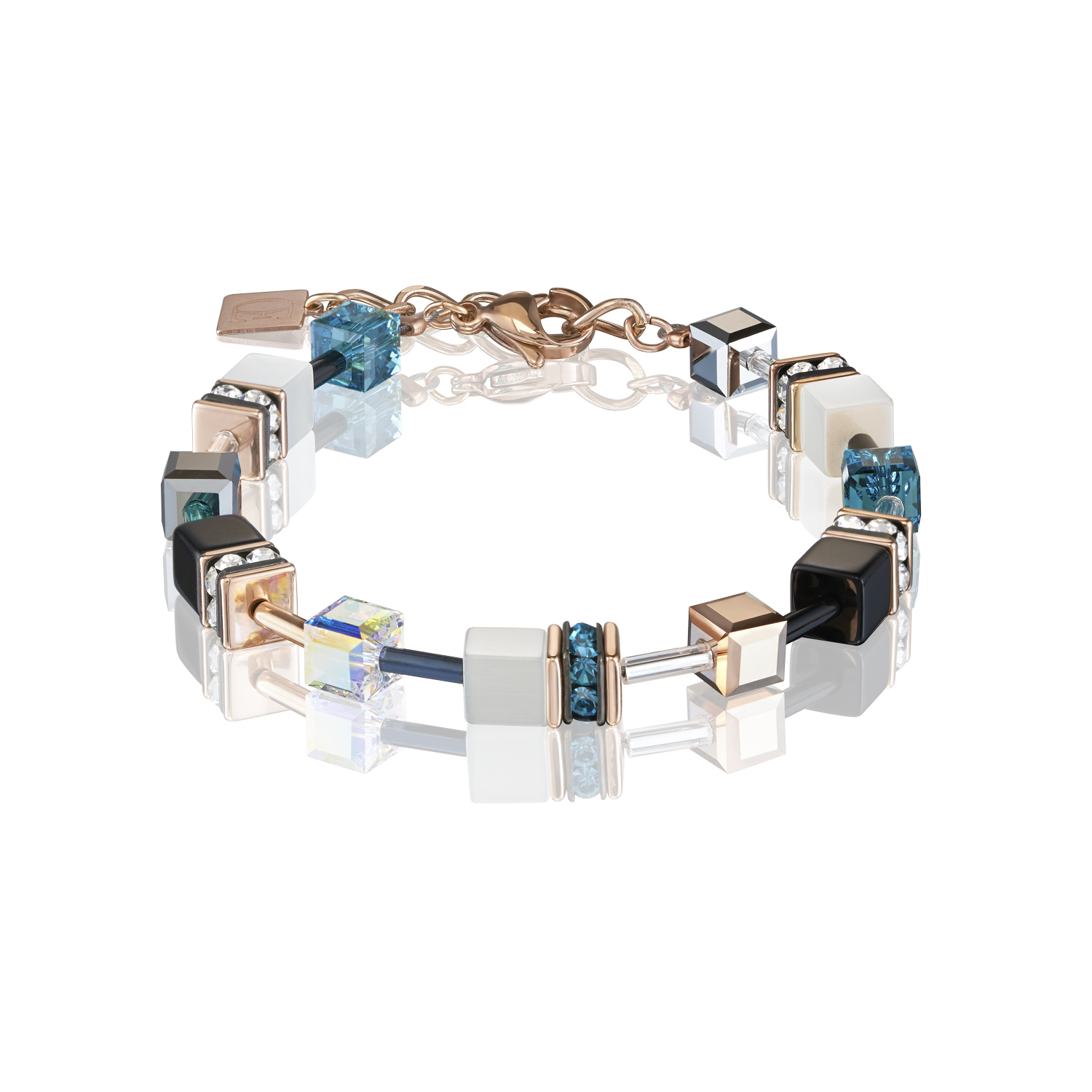 Bransoletka z kolekcji GeoCUBE®. Ręcznie wykończona, z syntetycznym, jednobarwnym tygrysim okiem, hematytem wykończonym tlenkiem tytanu w połączeniu z kryształami Swarovski® Crystals oraz stalą szlachetną, pokrywaną różowym złotem. Pełne wdzięku filigranowe połączenia z delikatnymi szklanymi elementami. Zapięcie wykonane jest ze stali szlachetnej w kolorze różowego złota.