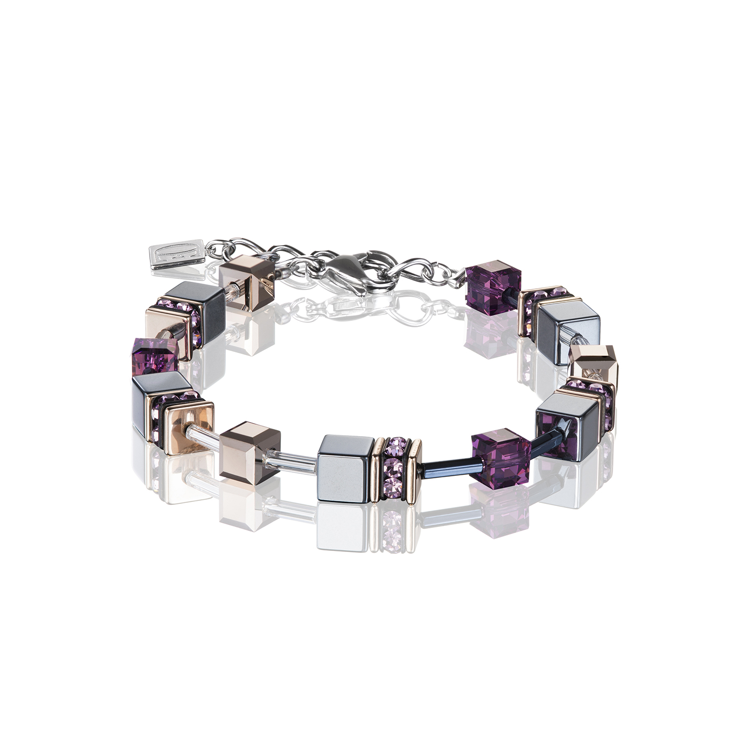 Bransoletka z kolekcji GeoCUBE. Pełne wdzięku połączenie hematytu, ametystu i kryształów Swarovski® Crystals oraz stali szlachetnej pokrywanej różowym złotem. Zapięcie wykonane jest ze stali szlachetnej.