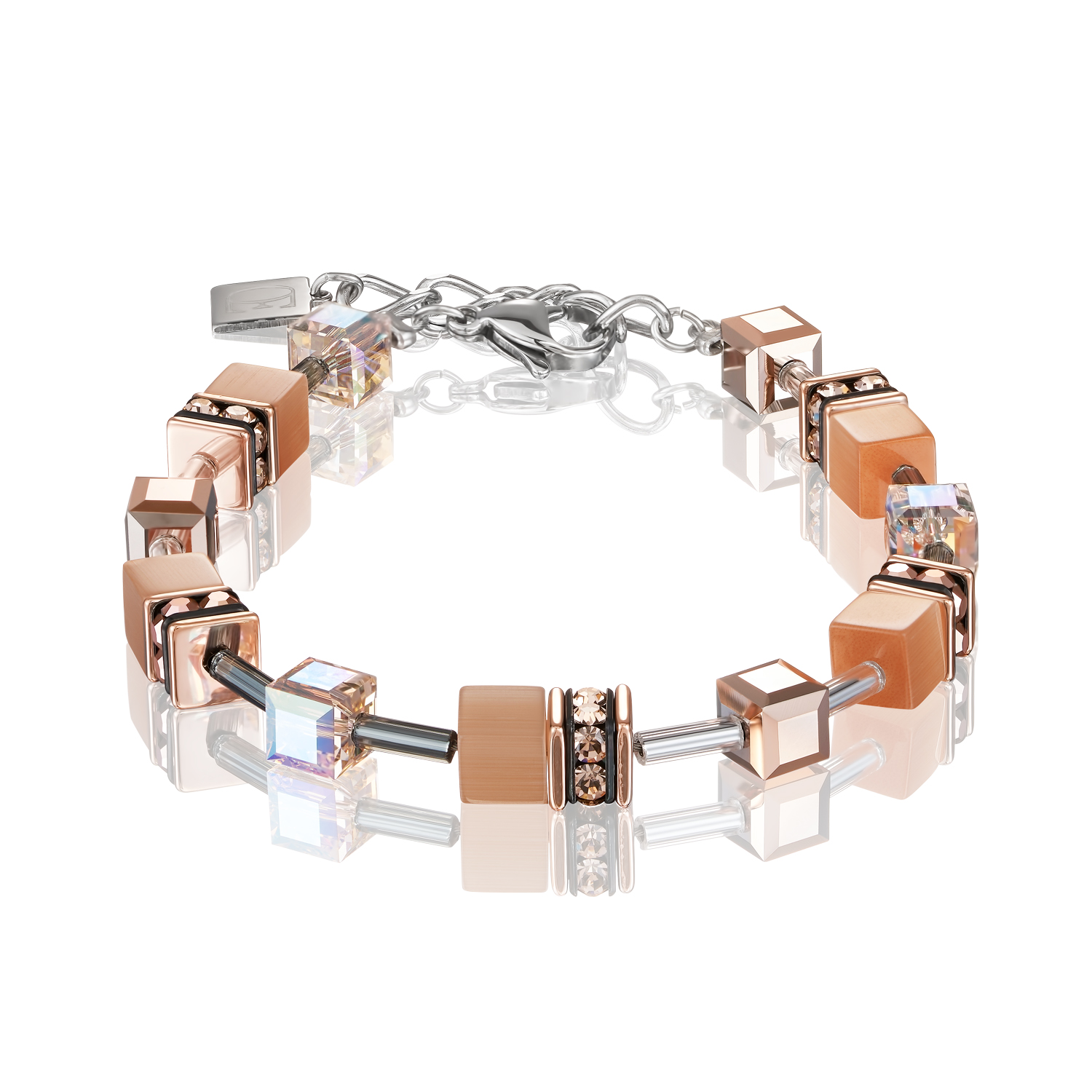 Z kolekcji GeoCUBE® elegancka bransoletka z ekscytującą kompozycją pięknych kolorów i materiałów, w tym: kryształy Swarovski® Crystals, kryształ górski i syntetyczne tygrysie oko. Zapięcie wykonane jest ze stali szlachetnej.