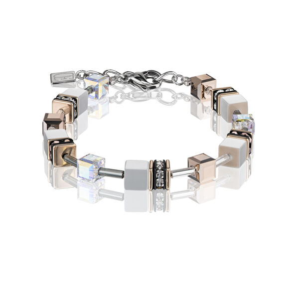 Delikatna bransoletka ręcznie wykończone z syntetycznego tygrysiego oka o jednolitym kolorze w połączeniu z błyszczącymi kryształami Swarovski® Crystals i kryształem górskim oraz stalą szlachetną pokrywaną różowym złotem. Zapięcie wykonane jest ze stali szlachetnej.