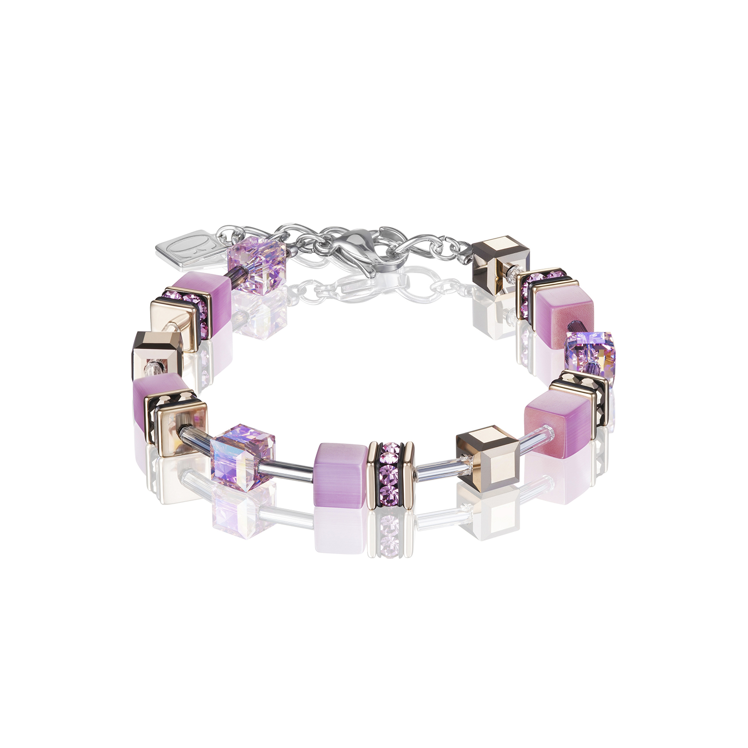 Ponadczasowo piękna bransoletka z kolekcji GeoCUBE. Ręcznie wykończona, z różowym tygrysim okiem w połączeniu z kryształami Swarovski® Crystals oraz stalą szlachetną pokrywaną różowym złotem. Pełne wdzięku filigranowe połączenia z delikatnymi szklanymi elementami. Zapięcie wykonane jest ze stali szlachetnej.