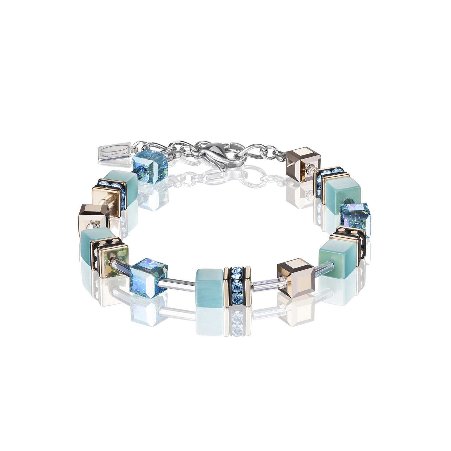 Bransoletka z kolekcji GeoCUBE. Ręcznie wykończona, z miętowym tygrysim okiem w połączeniu z kryształami Swarovski® Crystals i stalą szlachetną pokrywaną różowym złotem. Pełne wdzięku filigranowe połączenia z delikatnymi szklanymi elementami. Zapięcie wykonane jest ze stali szlachetnej.