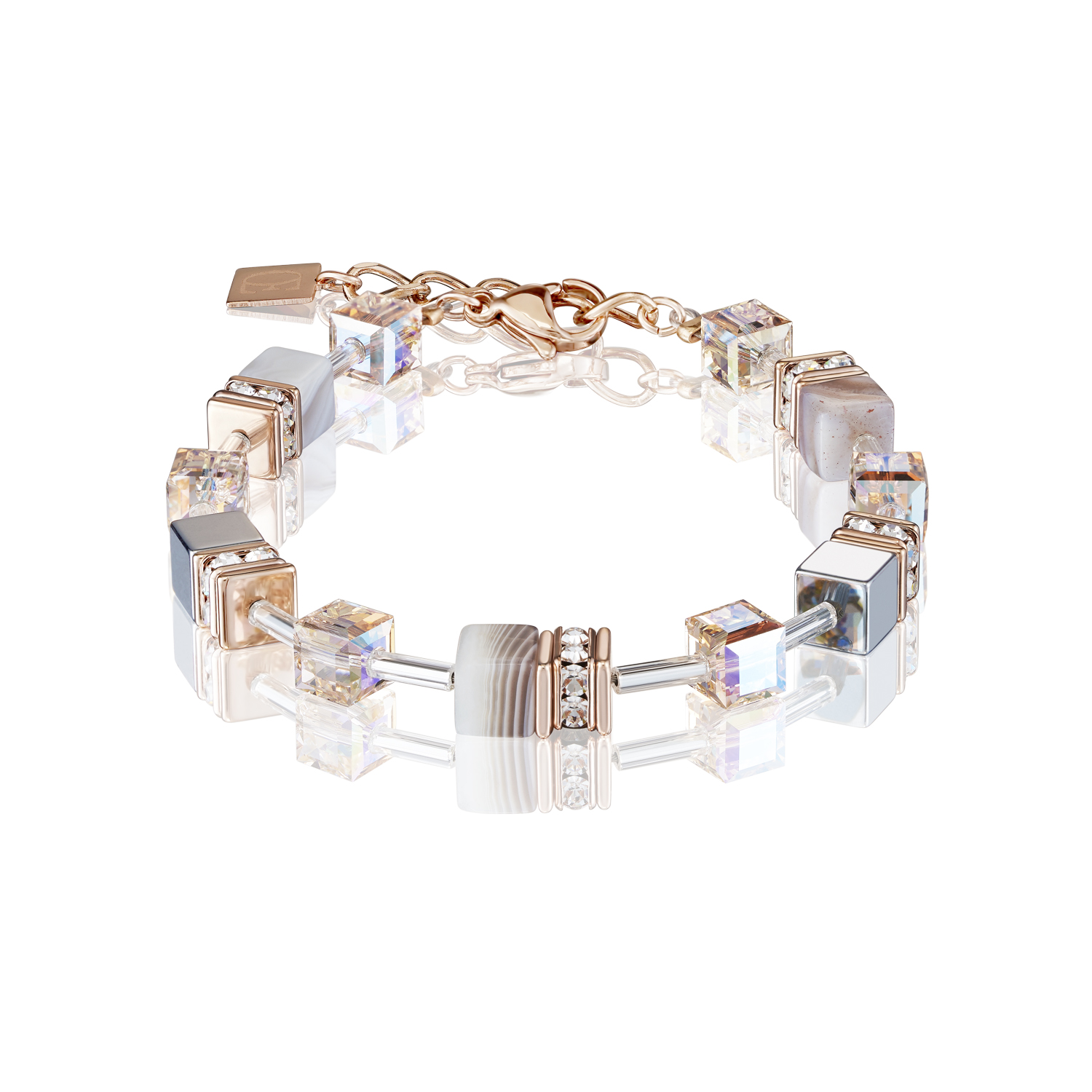 Bransoletka z kolekcji GeoCUBE. Pełne wdzięku połączenie agatu botswany, hematytu wykończonego tlenkiem tytanu, kryształu górskiego, kryształów Swarovski® Crystals ze stalą szlachetną pokrywaną różowym złotem. Zapięcie wykonane jest ze stali szlachetnej pokrywanej różowym złotem.