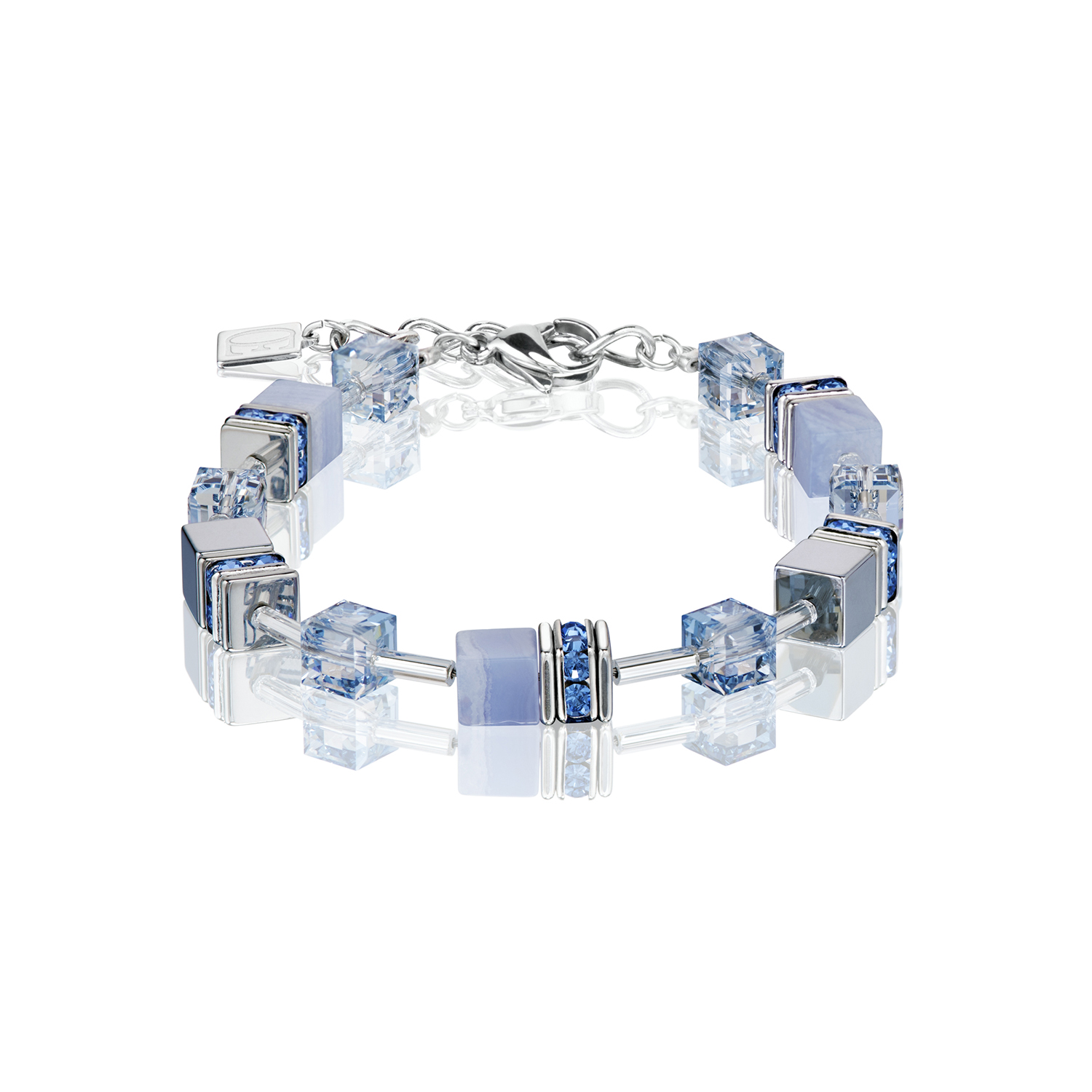 Bransoletka z kolekcji GeoCUBE®. Pełne wdzięku połączenie hematytu wykończonego tlenkiem tytanu, chalcedonu, kryształów Swarovski® Crystals oraz kryształu górskiego ze stalą szlachetną. Zapięcie wykonane jest ze stali szlachetnej.