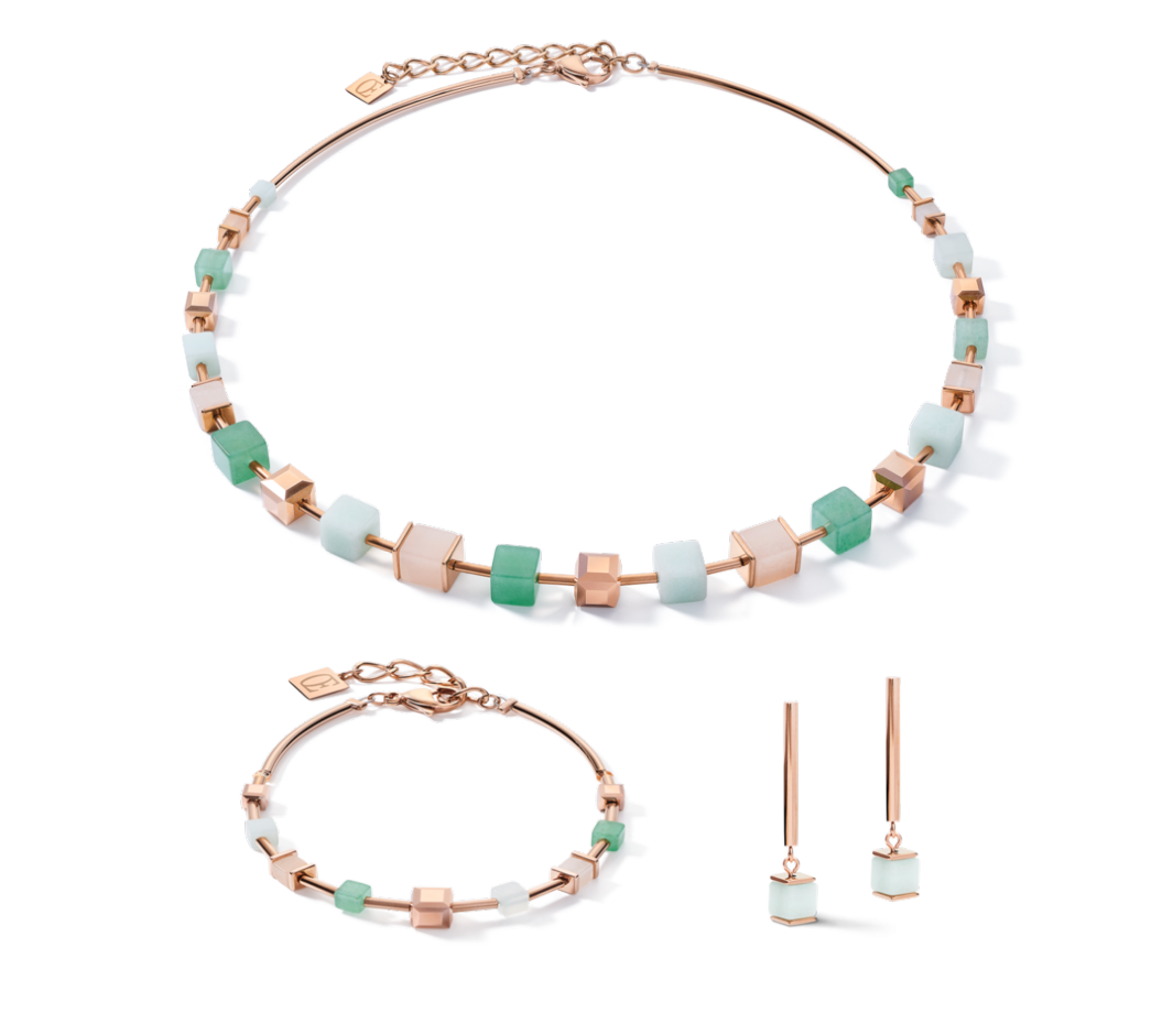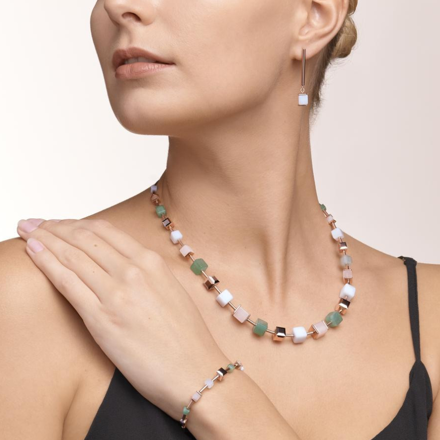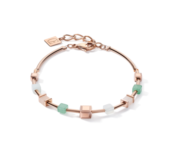 NATURALNE CHWILE RADOŚCI. Różowy kwarc, zielony awenturyn, amazonit – blade, pastelowe odcienie kamieni szlachetnych sprawiają, że ta bransoletka z kolekcji GeoCUBE® to cudownie lekki model. Wykonana ręcznie w Niemczech ze stali szlachetnej.