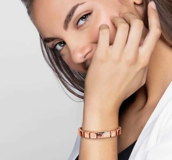 Elastyczna bransoletka wykonana ze stali szlachetnej pokrytej powłoką PVD w kolorze różowego złota z 1 elementem ozdobnym w kształcie serca wypełnionego czarną emalią. Bransoletka składa się z 19 elementów.