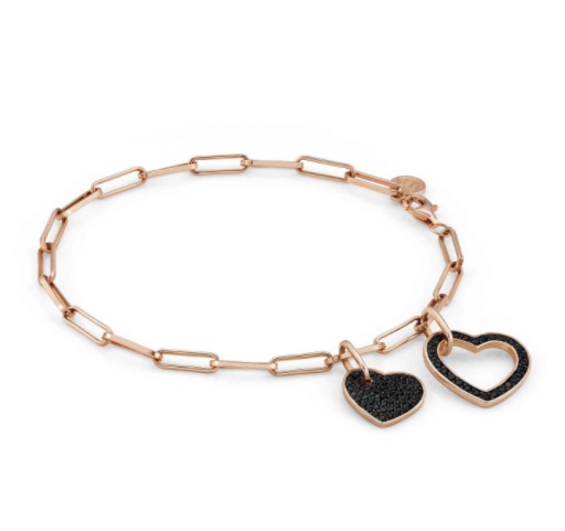 Bransoletka wykonana ze srebra pr. 925 pokrywana 22K różowym złotem z dwiema zawieszkami zdobionymi cyrkoniami osadzanymi metodą pavè z czarnym rodowaniem.