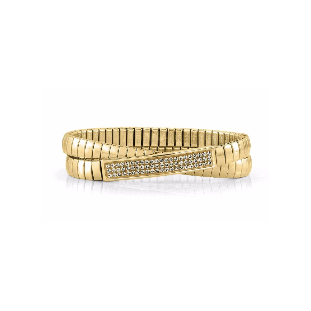 Podwójna elastyczna bransoletka wykonana z wysokiej jakości stali szlachetnej pokrywaną powłoką PVD w kolorze złota z szampańskimi kryształami Swarovskiego. Pozbawiona substancji uczulających.