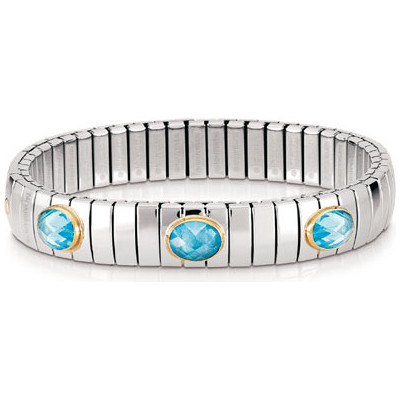 Bransoletka NOMINATION wykonana z wysokiej klasy stali szlachetnej z błękitnymi cyrkoniami w oblamówce z 18k złota. Pozbawiona substancji uczulających. Rozciągliwa, całość składa się z linków połączonych za pomocą ruchomych zaczepów, przez co łatwo dopasowuje się do ręki. Wybierz swoją kompozycję i podkreśl jaka jesteś.