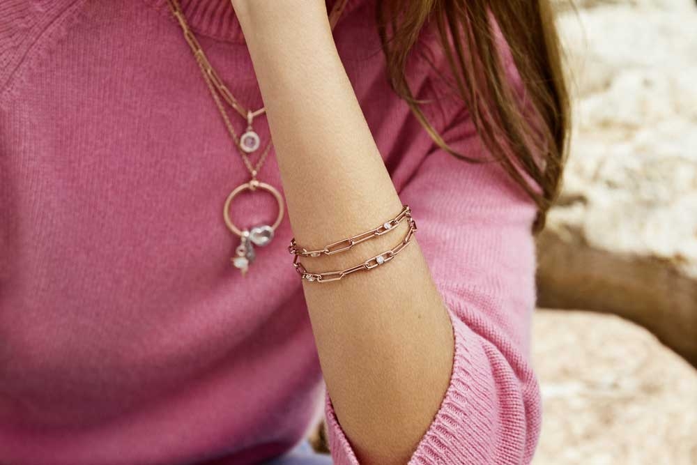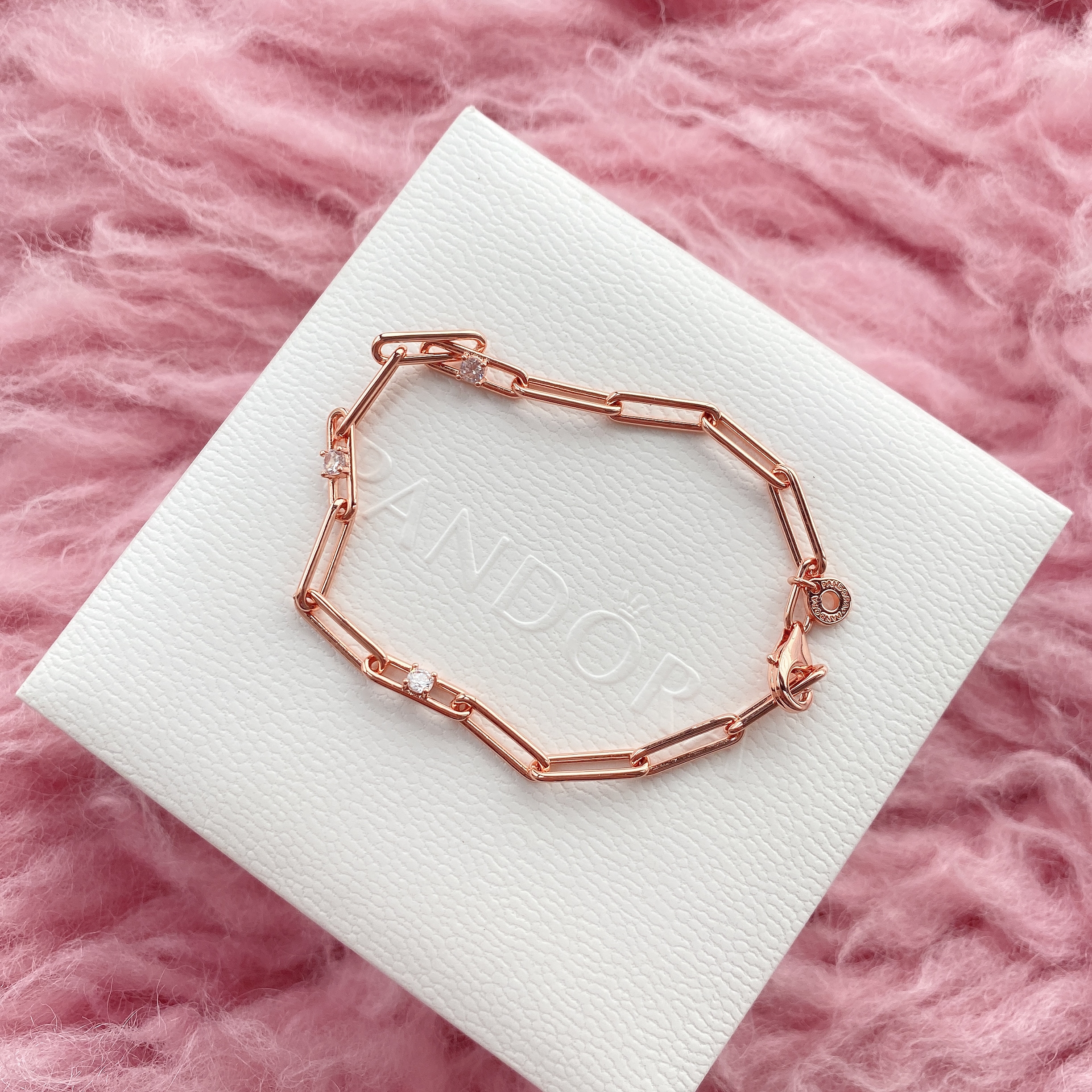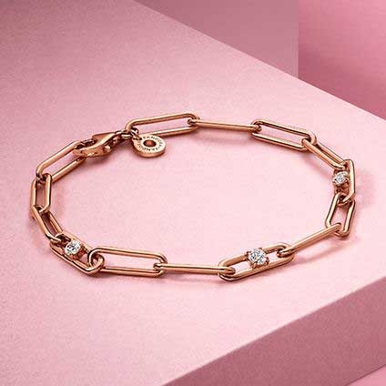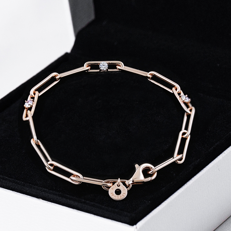 Jeśli szukasz wyrafinowanego akcentu, postaw na bransoletkę łańcuszkową z kamieniami. Ta klasyczna, masywna bransoletka została wykonana ręcznie z naszego unikalnego stopu metali Pandora Rose platerowanego 14-karatowym różowym złotem. Na trzech elementach łączących bransoletki umieszczono bezbarwne cyrkonie sześcienne, które dodają jej blasku. Do zapięcia przymocowano ozdobną zawieszkę. Noś z innymi łańcuszkowymi elementami biżuterii, aby osiągnąć efekt elegancji z pazurem.