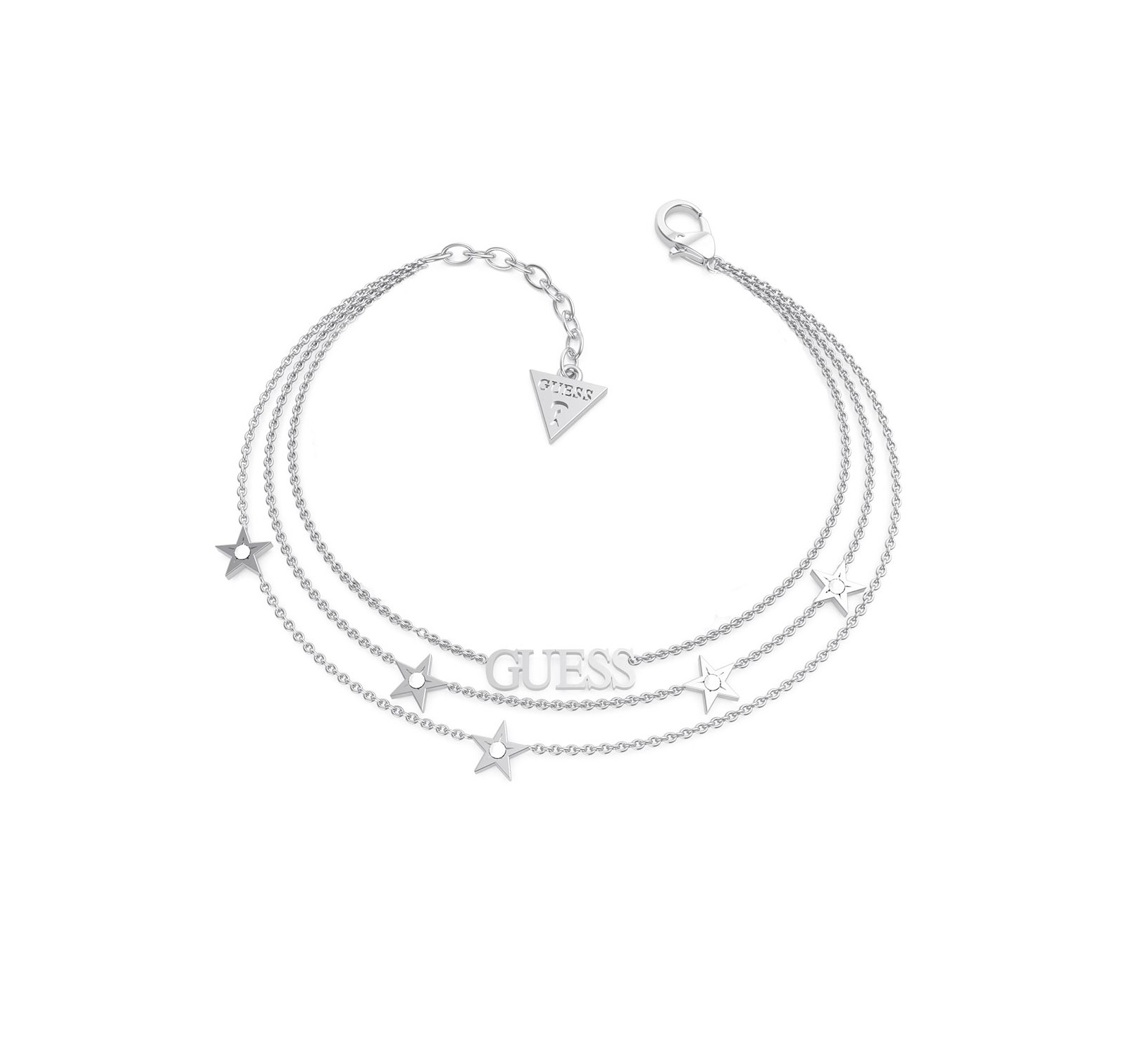 Bransoletka z logiem Guess wykonany z stali nierdzewnej. Bransoletka złożony z kilku łańcuszków zdobionych gwiazdkami z kryształkami Swarovskiego i logiem marki . Zapięcie na karabińczyk.