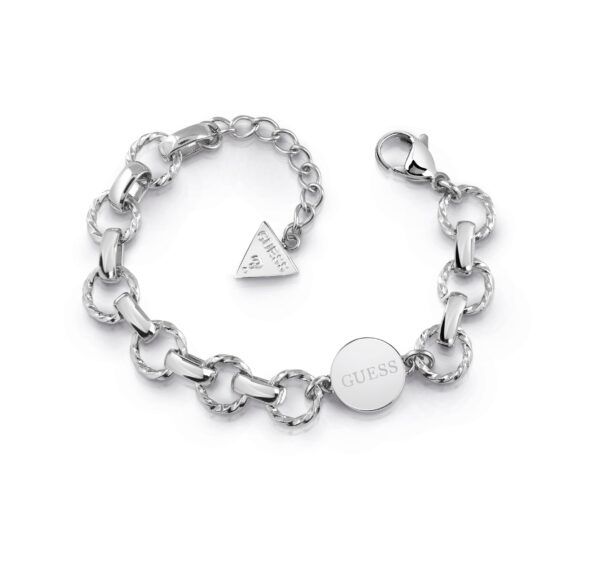 Ponadczasowa bransoletka z kolekcji “Chain Reaktion” wykonana ze stali nierdzewnej na grubym łańcuchu. Na środku znajduje się logo Guess , które podkreśla luksusowy wygląd biżuterii. Zapięcie na karabińczyk. Możliwość regulacji.