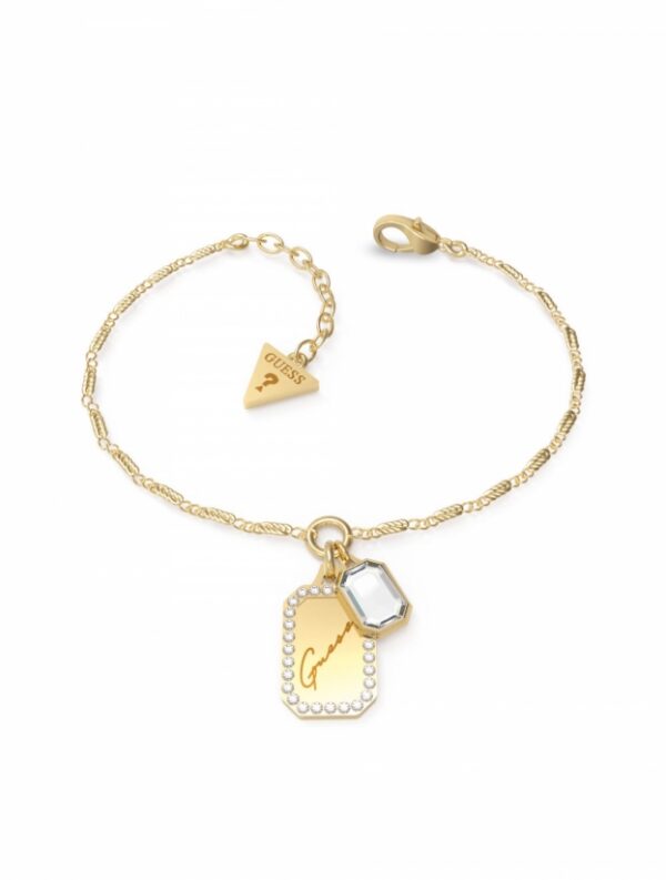 Ponadczasowa bransoletka z wisiorkami z kolekcji “Crystal Tag” wykonana ze stali nierdzewnej platerowanej żółtym złotem na łańcuszku. Pośrodku jednej z zawieszek znajduje się napis „ Guess ”, który podkreśla luksusowy wygląd biżuterii, druga zaś ozdobiona jest kryształem. Zapięcie na karabińczyk. Możliwość regulacji.