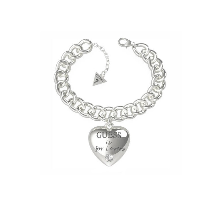 Ponadczasowa bransoletka z wiszącym sercem z kolekcji “Guess Is For Lovers” wykonana ze stali nierdzewnej na grubym łańcuchu. Na środku zawieszki znajduje się napis „ Guess is for Lovers”, który podkreśla luksusowy wygląd biżuterii. Zapięcie na karabińczyk. Możliwość regulacji.