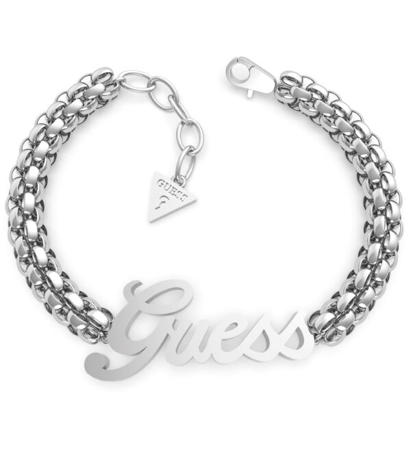 Ponadczasowa bransoletka z kolekcji “Logo Power” wykonana ze stali nierdzewnej na grubszym łańcuchu. Pośrodku znajduje się napis „ Guess ”, który podkreśla luksusowy wygląd biżuterii. Zapięcie na karabińczyk. Możliwość regulacji.