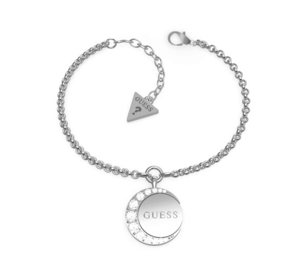 Ponadczasowa bransoletka z zawieszką z kolekcji “Moon Phases” wykonana ze stali nierdzewnej łańcuszku. Na środku zawieszki znajduje się logo Guess, który podkreśla luksusowy wygląd biżuterii. Brzegi zdobione są kryształami. Zapięcie na karabińczyk. Możliwość regulacji.