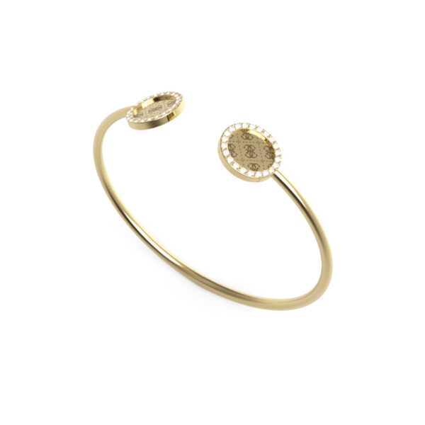 Wyjątkowa bransoleta wykonana ze stali szlachetnej. Bransoleta typu bangle zdobiona jest kółkami grawerowanymi logiem 4G i cyrkoniami. Produkt platerowany żółtym złotem dla ekskluzywnego designu i wyższej odporności na uszkodzenia. Ostatni krzyk mody i idealny dodatek dla kobiet, które uwielbiają finezyjne i nowoczesne akcenty w swojej stylizacji.
