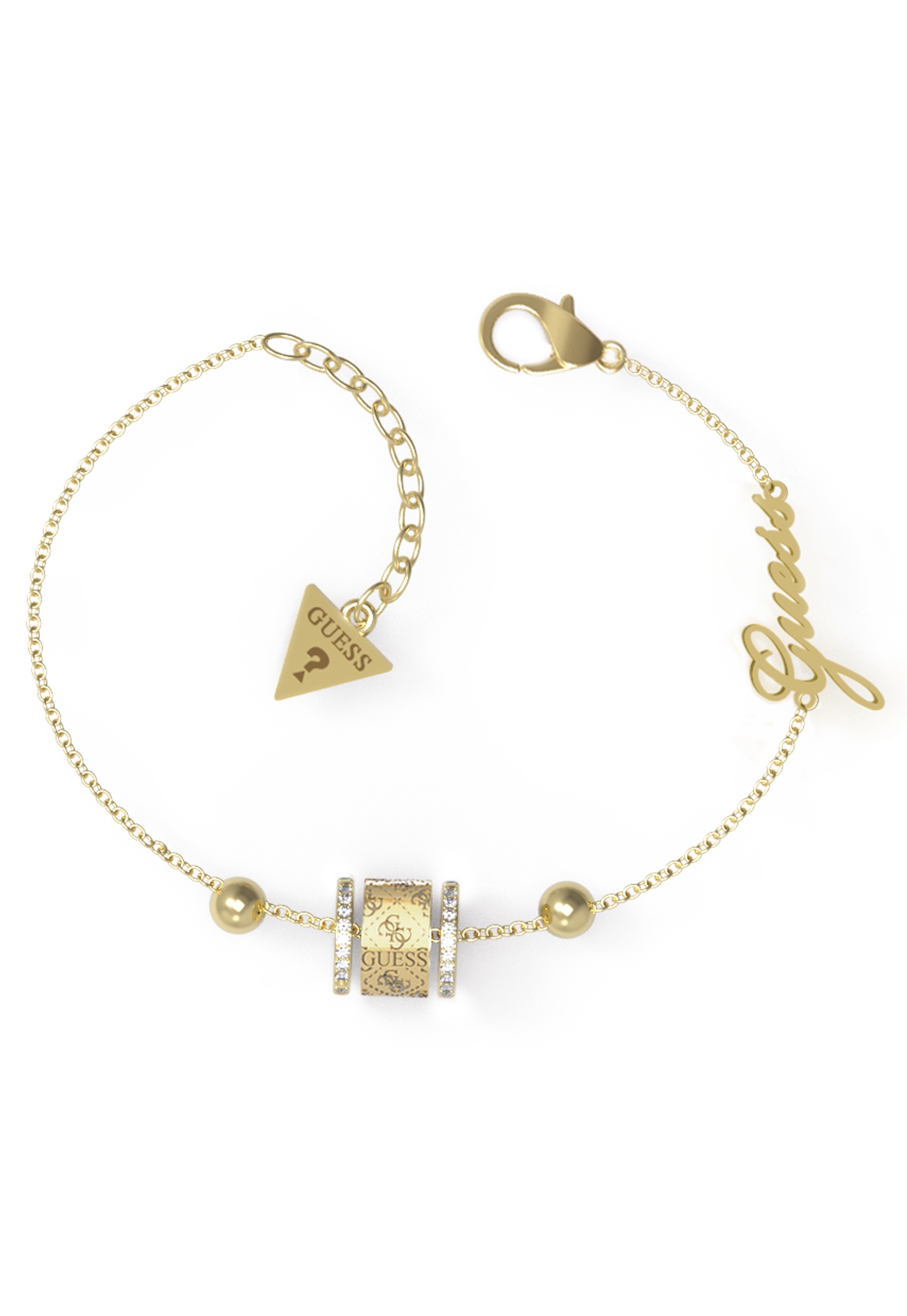 Ponadczasowa bransoletka z logiem 4G i cyrkoniami z kolekcji “Round Harmony” wykonana ze stali nierdzewnej platerowanej żółtym złotem na łańcuszku wśród którego znajduje się napis “Guess”. Zapięcie na karabińczyk. Możliwość regulacji.