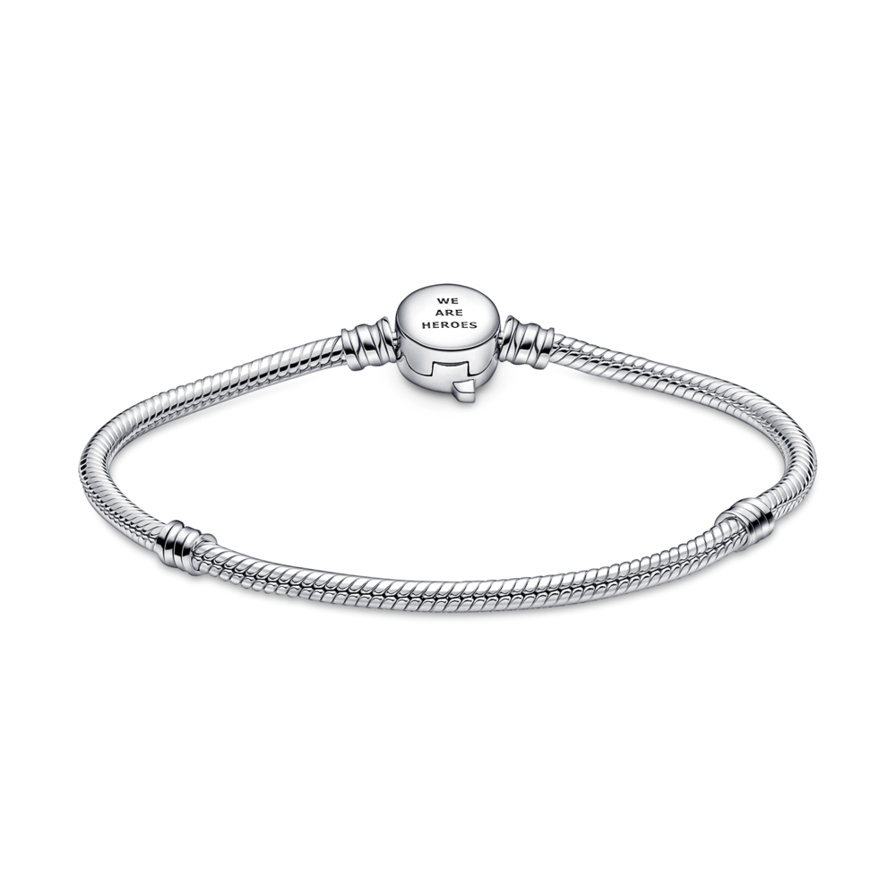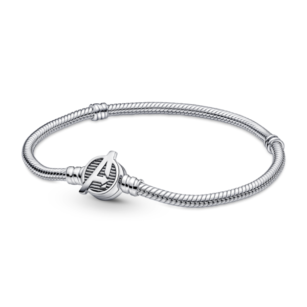 Zwołaj swoich bohaterów na tej bransoletce wężykowej Pandora Moments z logo Avengers. Została wykończona ręcznie ze srebra i ozdobiona zapięciem ze słynnym znakiem Avengers oraz wyżłobionymi pasmami. Pokaże światu, kto jest Twoim największym bohaterem i jak bardzo kochasz produkcje Marvela. Możesz ją ozdobić maksymalnie 18 charmsami.