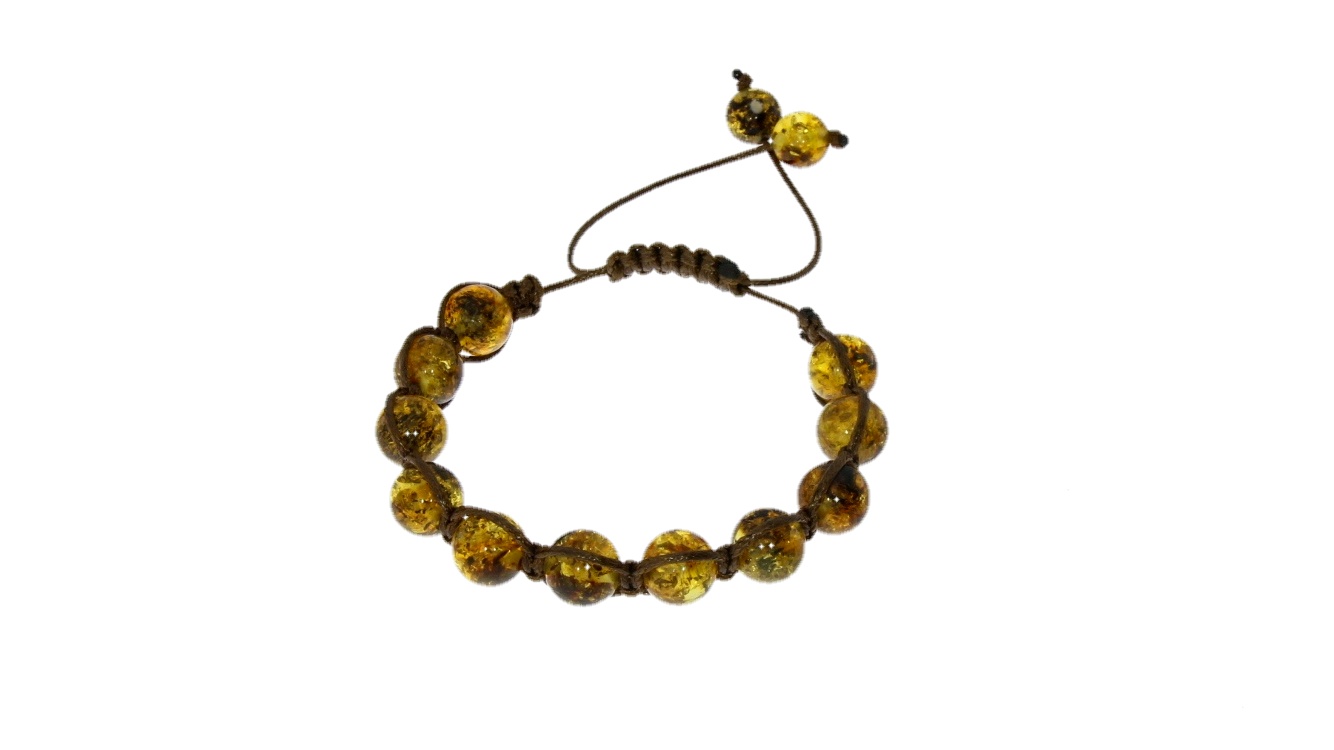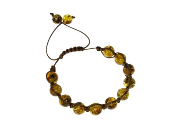 Bransoletka z bursztynem w kolorze jasnego brązu opleciona nylonowym sznurkiem. Zapięcie makramowe zapewnia doskonałe dopasowanie rozmiaru bransoletki do nadgarstka.