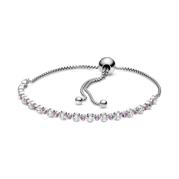 Wzbogać swoją stylizację różowym akcentem w postaci tej błyszczącej srebrnej bransoletki ze ściąganym zapięciem. Ręcznie wykańczana bransoletka tenisowa ma połyskujące detale w dwóch odcieniach. Przezroczyste cyrkonie sześcienne i różowe szafiry syntetyczne o różnych rozmiarach zostały ułożone na przemian, aby zapewnić wyjątkowy kontrast. Bransoletkę można ręcznie regulować za pomocą ściąganego zapięcia umożliwiającego perfekcyjne dopasowanie. To stylowa ozdoba, która będzie klasycznym i wszechstronnym dodatkiem do Twojej kolekcji i którą będziesz nosić przez długie lata.