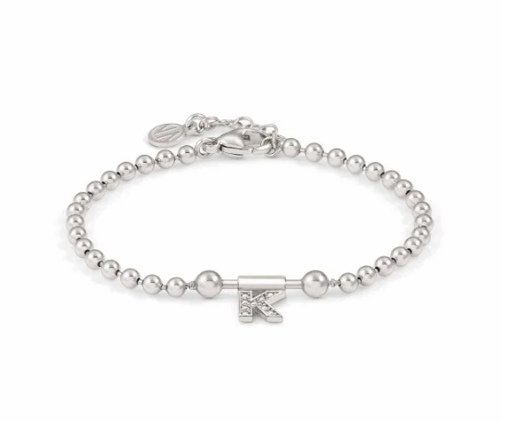 Bransoletka wykonana ze srebra próby 925 rodowana, składająca się z małych, subtelnych kuleczek, z zawieszką w kształcie litery K z cyrkoniami Swarovskiego i pokrytą rodem, by zapobiec jej zmatowieniu. Biżuterię można personalizować za pomocą zawieszek z kolekcji SeiMia. Ułóż litery w imię, szczególny dla Ciebie napis lub dodaj inicjały swojej prawdziwej miłości.
