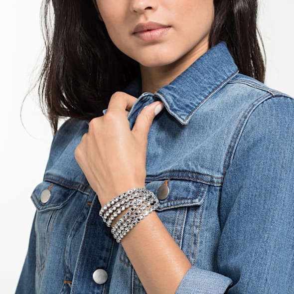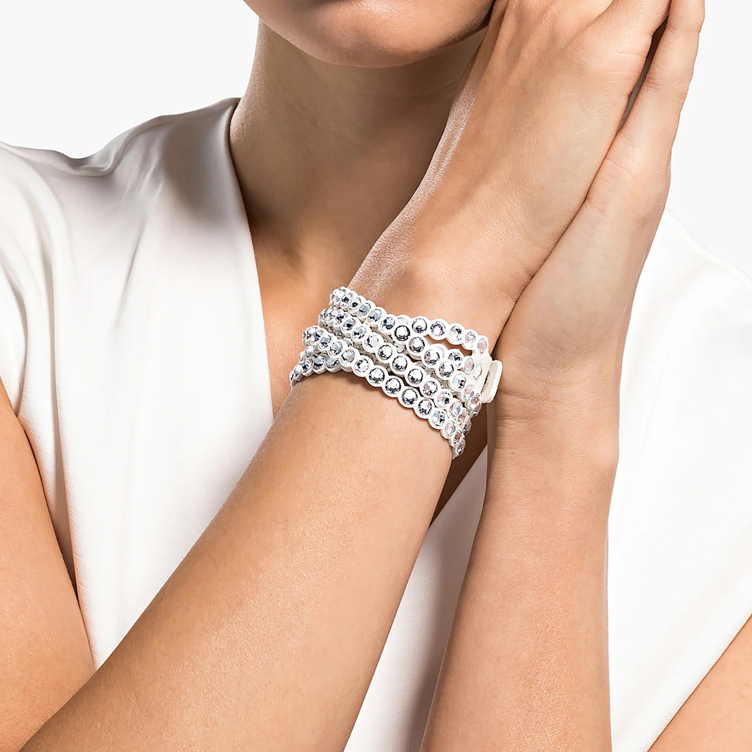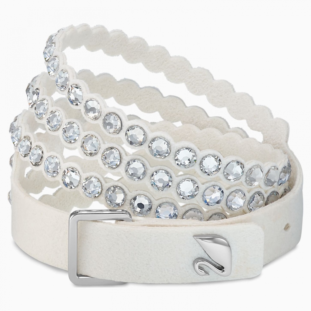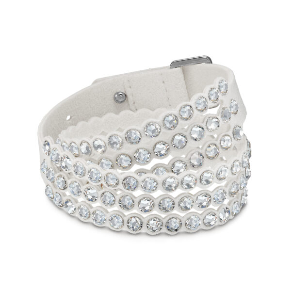 Ta nowoczesna bransoletka marki Swarovski ozdobiona jest licznymi bezbarwnymi kryształami Swarovskiego na białej tkaninie Alcantara®. Trzy rzędy połyskujących kryształów elegancko oplatają nadgarstek, tworząc swobodny, niezobowiązujący efekt. Klamra w kształcie łabędzia Swarovskiego tworzy urocze zapięcie tej pasującej niemal do wszystkiego bransoletki. Urocza biżuteria na dzień i wieczór to doskonały pomysł na prezent dla siebie lub bliskiej osoby.