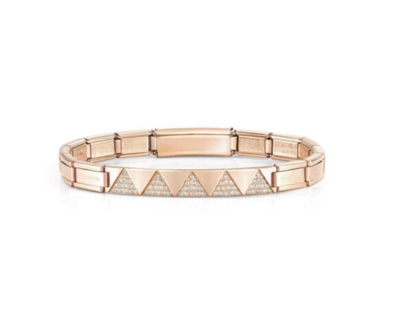 Bransoletka Nomination Italy z kolekcji Trendsetter New York. Elastyczna, wykonana ze stali szlachetnej pokrywana różowym złotem metodą PVD. Zdobiona piramidami, wysadzanymi białymi cyrkoniami Pavé. Idealna bransoletka dla kobiet odważnych i pewnych siebie, które pragną błyszczeć jak światła Nowego Jorku nocą! Połącz bransoletkę dowolnie z innymi produktami marki NOMINATION ITALY i stwórz swój niepowtarzalny zestaw!