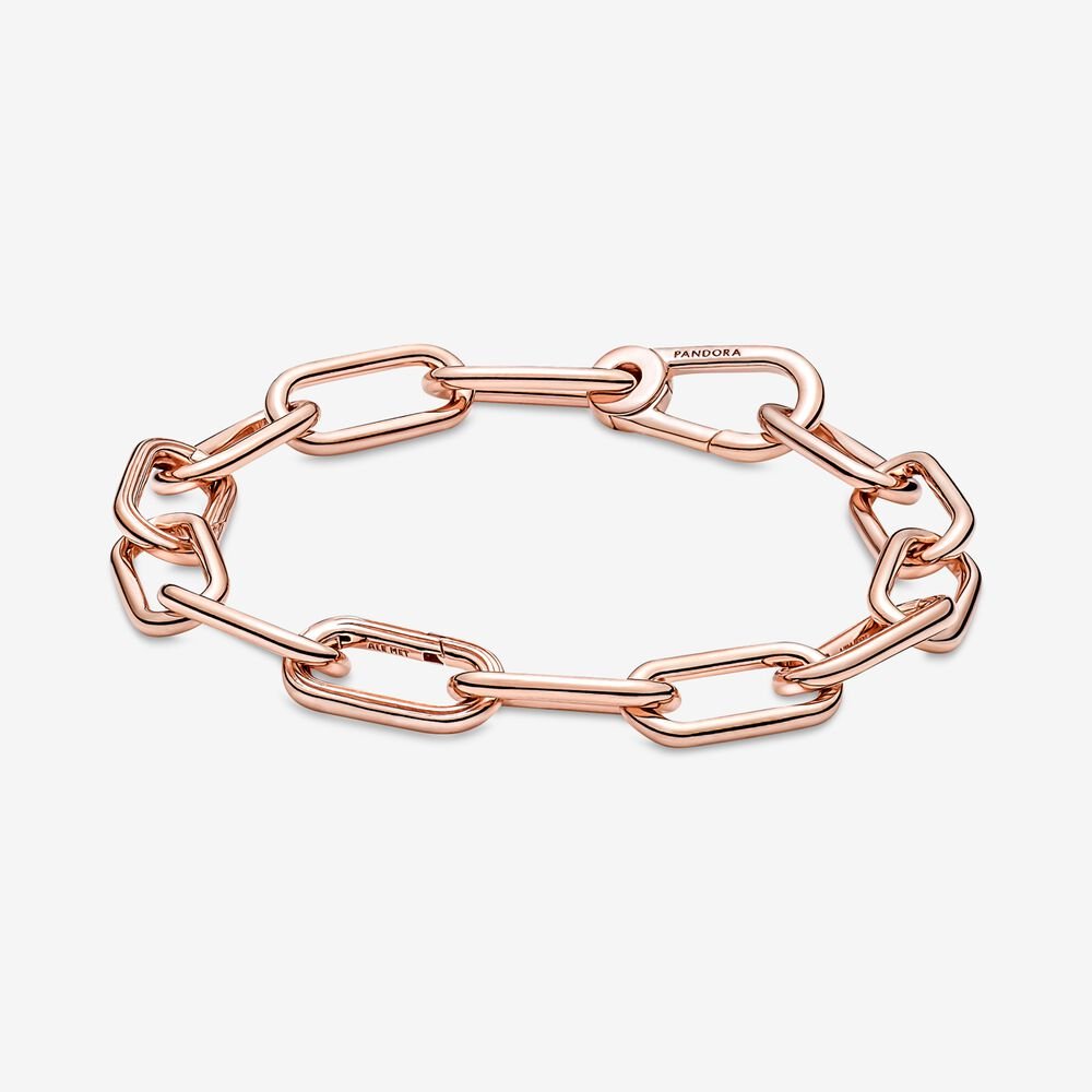 Noś swoją mantrę na nadgarstku. Nasza pozłacana 14-karatowym różowym złotem bransoletka z ogniwami Pandora ME daje nieskończone możliwości stylizacji. Bransoletka posiada trzy otwierane łączniki, które wyróżniają się rowkowaną powierzchnią, ozdobne ogniwa oraz zapięcie karabińczykowe. Na początku dopasuj swoją bransoletkę: jeden zestaw splecionych ogniw można zamienić pomiędzy każdym ozdobnym łącznikiem na cztery małe splecione ogniwa, podwójne ozdobne ogniwo lub jedno ozdobne ogniwo – zachowaj oryginalną długość lub dopasuj ją do siebie. Kiedy wybierzesz już swoją bransoletkę, dodaj dwa wymowne medaliony lub maksymalnie osiem małych zawieszek na każdym otwieranym łączniku lub jeden medalion na ozdobnym ogniwie, aby pokazać światu, kim jesteś.