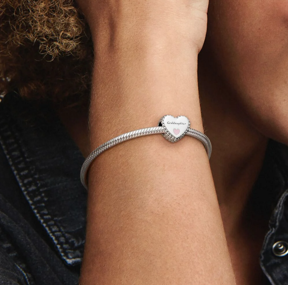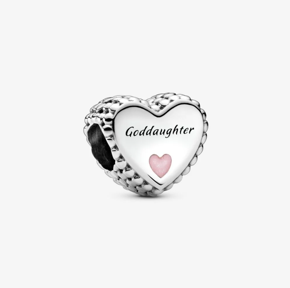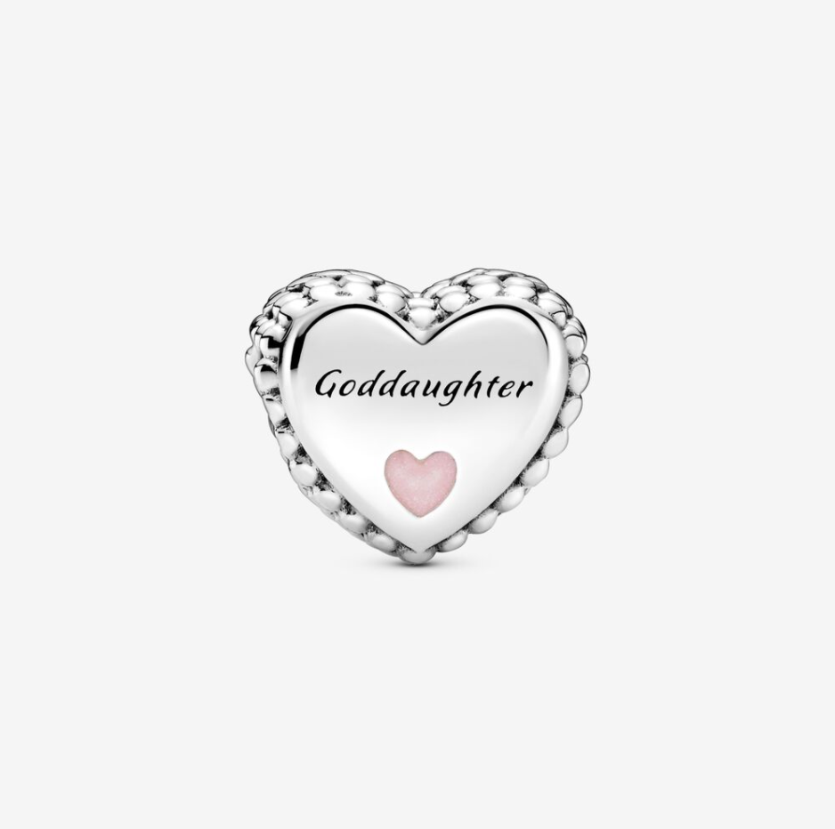 Ciesz się bliską relacją z charmsem „Córka chrzestna” w kształcie serca. Charms o symetrycznym wzorze, wykonany ręcznie ze srebra. Po obu stronach znajduje się niewielkie serduszko wypełnione ręcznie emalią w kolorze perłoworóżowym. Element posiada wygrawerowany napis „Córka chrzestna” oraz wysadzane koralikami brzegi. Środkowy rząd koralików w kształcie serduszek tworzy unikalne wykończenie. Słodki dodatek do każdej bransoletki Pandora Moments. Podaruj charmsa z napisem „Córka chrzestna” osobie, którą kochasz, aby podkreślić wyjątkowość Waszej relacji.