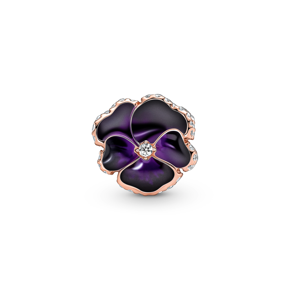 Charms z fioletowym bratkiem doda wiośnie kolorów. Każdy bratek platerowany 14-karatowym różowym złotem, ozdobiony lśniącymi, przezroczystymi cyrkoniami sześciennymi i emalią jest absolutnie niepowtarzalny. Najnowszy kwiat w naszym ogrodzie, bratek, symbolizuje różne kształty miłości. Połącz go w spójną kompozycję z inną biżuterią z bratkami, a będzie Ci przypominać o wszystkich, których kochasz.