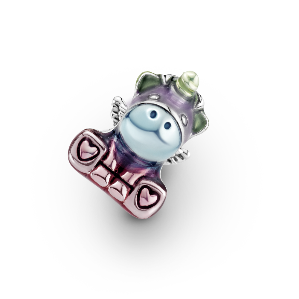 Pokaż wszystkie kolory swojej osobowości charmsem Kolorowa tęcza i Jednorożec Bruno. Cieniowana tęcza została pomalowana ręcznie bladoróżową, błękitną, lawendową i zieloną emalią. Jednorożec ma kopytka ozdobione na spodzie sercami oraz polerowany na błysk róg, grzywę, skrzydła i ogon.