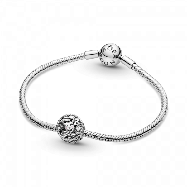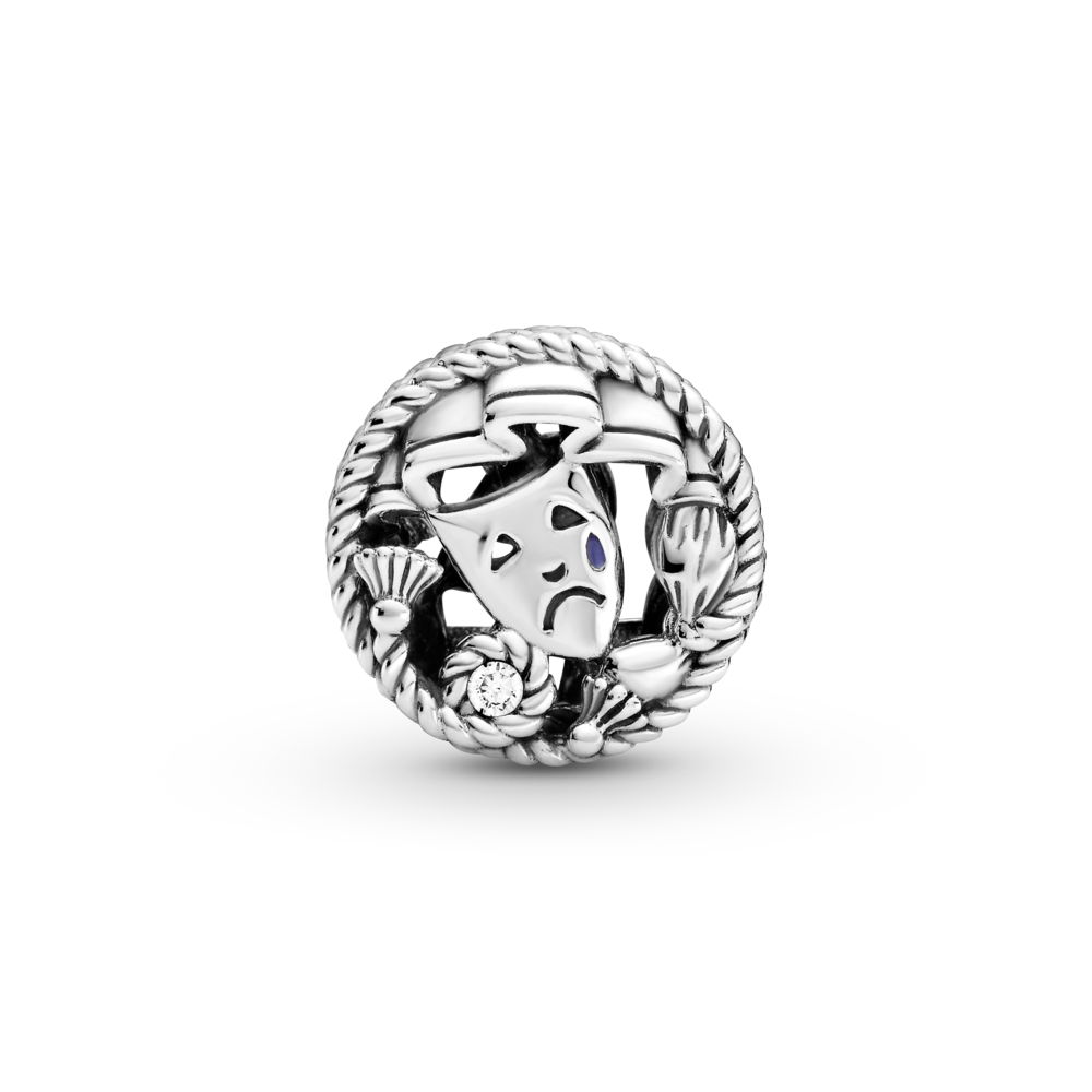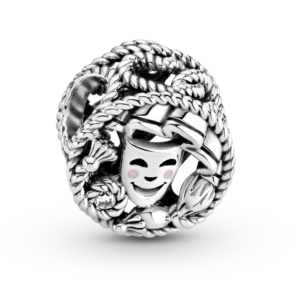 Okazuj swoje uczucia charmsem z maskami Komedia i Tragedia. Ten misternie zdobiony srebrny charms został zainspirowany teatrem oraz sztuką wyrażania siebie. Uśmiechnięta maska ma policzki muśnięte różową emalią, a jej rewersem jest maska smutna, po której policzku spływa łezka z błękitnej emalii. Maski są otoczone plątaniną chwostów oraz lin 3D, które po każdej stronie zostały ozdobione lśniącym kamieniem i układają się w kształt serca. Pokaż obie strony swojej osobowości – w najlepszym stylu.