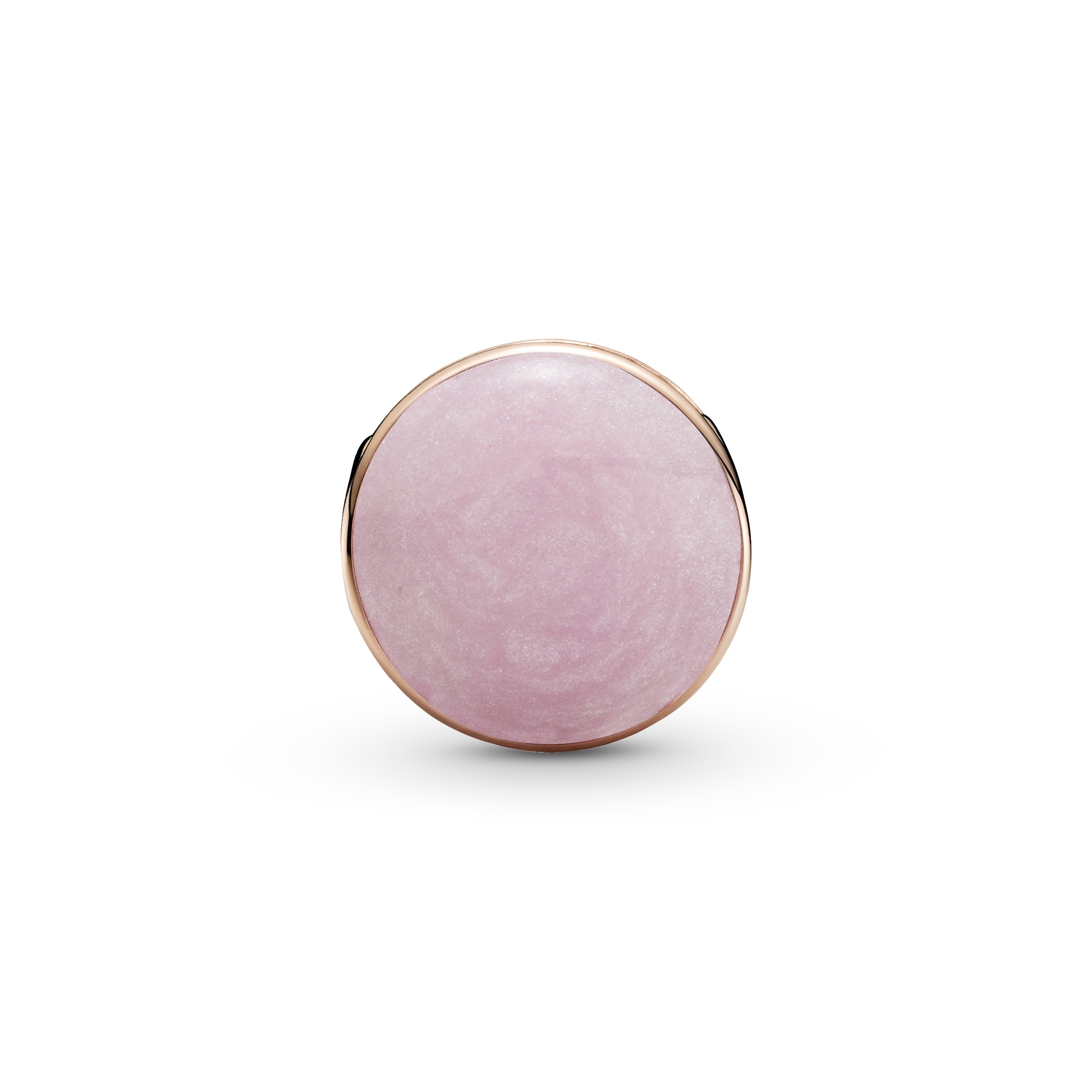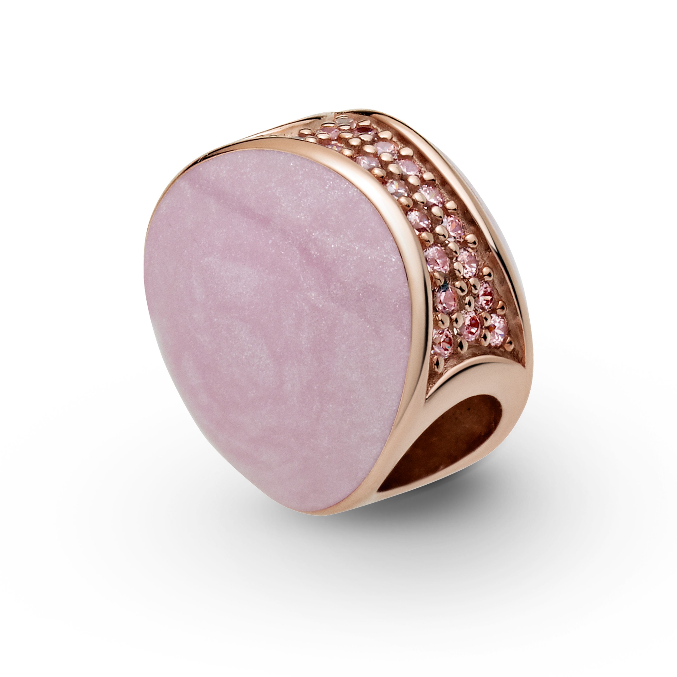 Nieprzezroczysty charms z różową serpentyną inspirowany jest naturalnymi kamieniami cechującymi się niedoskonałościami. Ten perłowy różowy charms jest opatrzony ręcznie nakładaną emalię, która wyglądem przypomina kwarc różowy z przodu i z tyłu oraz 38 bajecznymi cyrkoniami sześciennymi w oprawie pavé po bokach. Został wykonany z Pandora Rose.