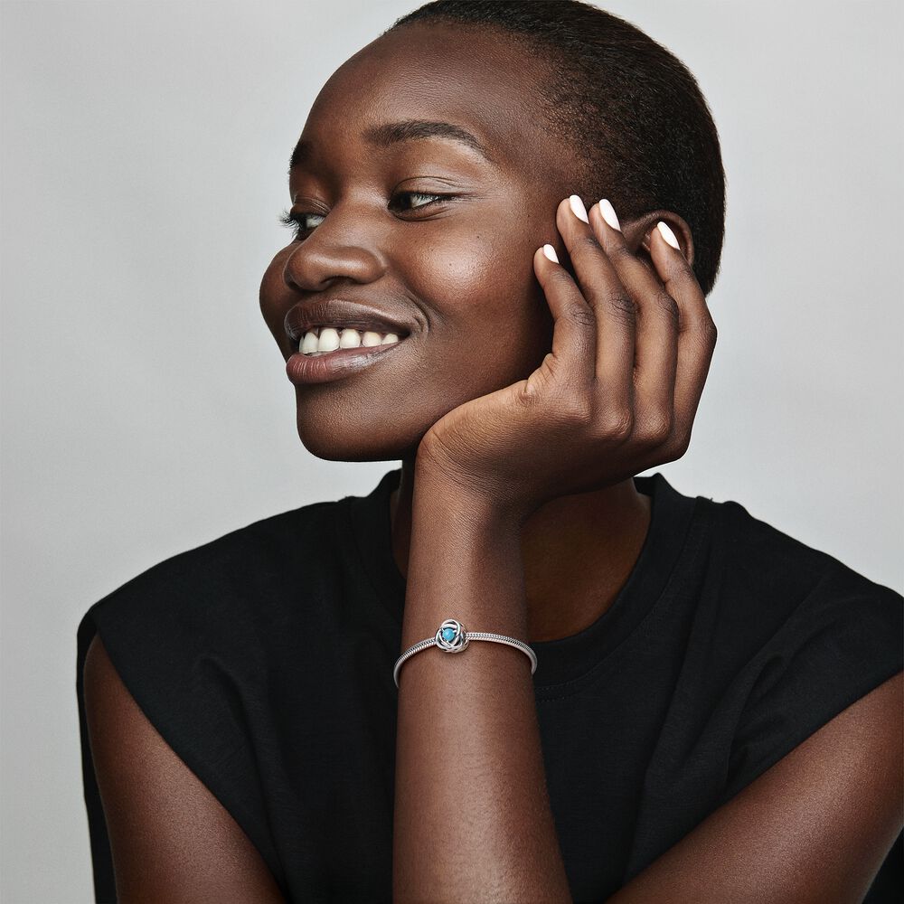Dodaj nieco blasku swojej bransoletce i wisiorkom dzięki charmsowi z turkusowym symbolem wieczności. Ta wyjątkowa ozdoba ma kształt symbolu nieskończoności, a jej środek zdobi turkusowy kamień o szlifie kaboszonowym. Urozmaić swój styl tym olśniewającym charmsem symbolizującym wieczność.