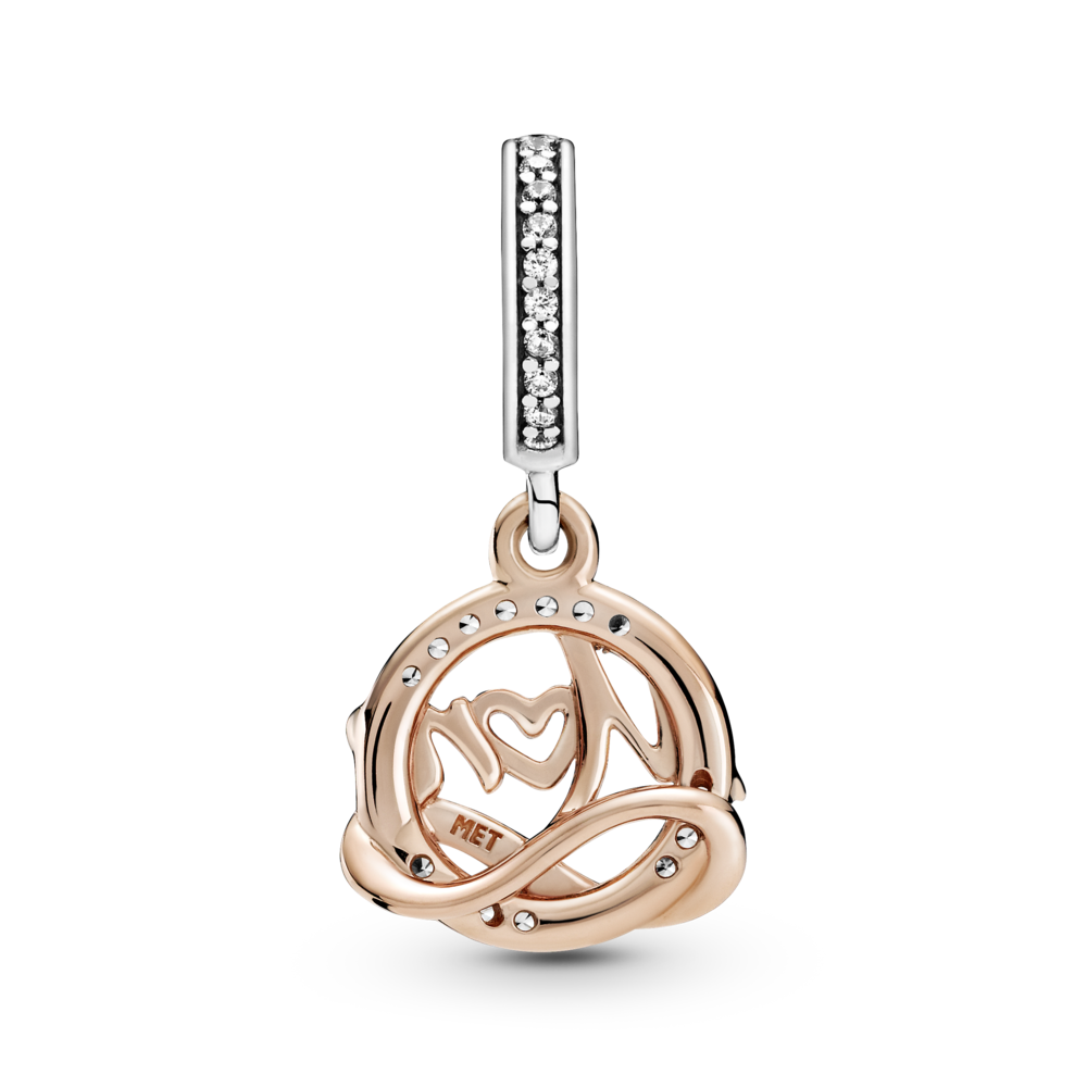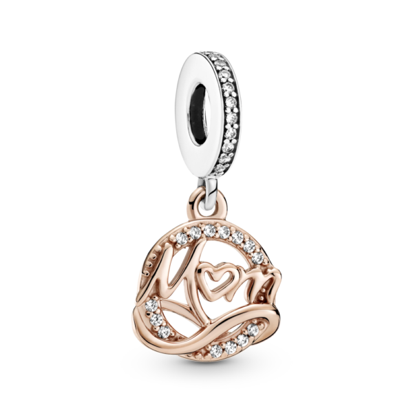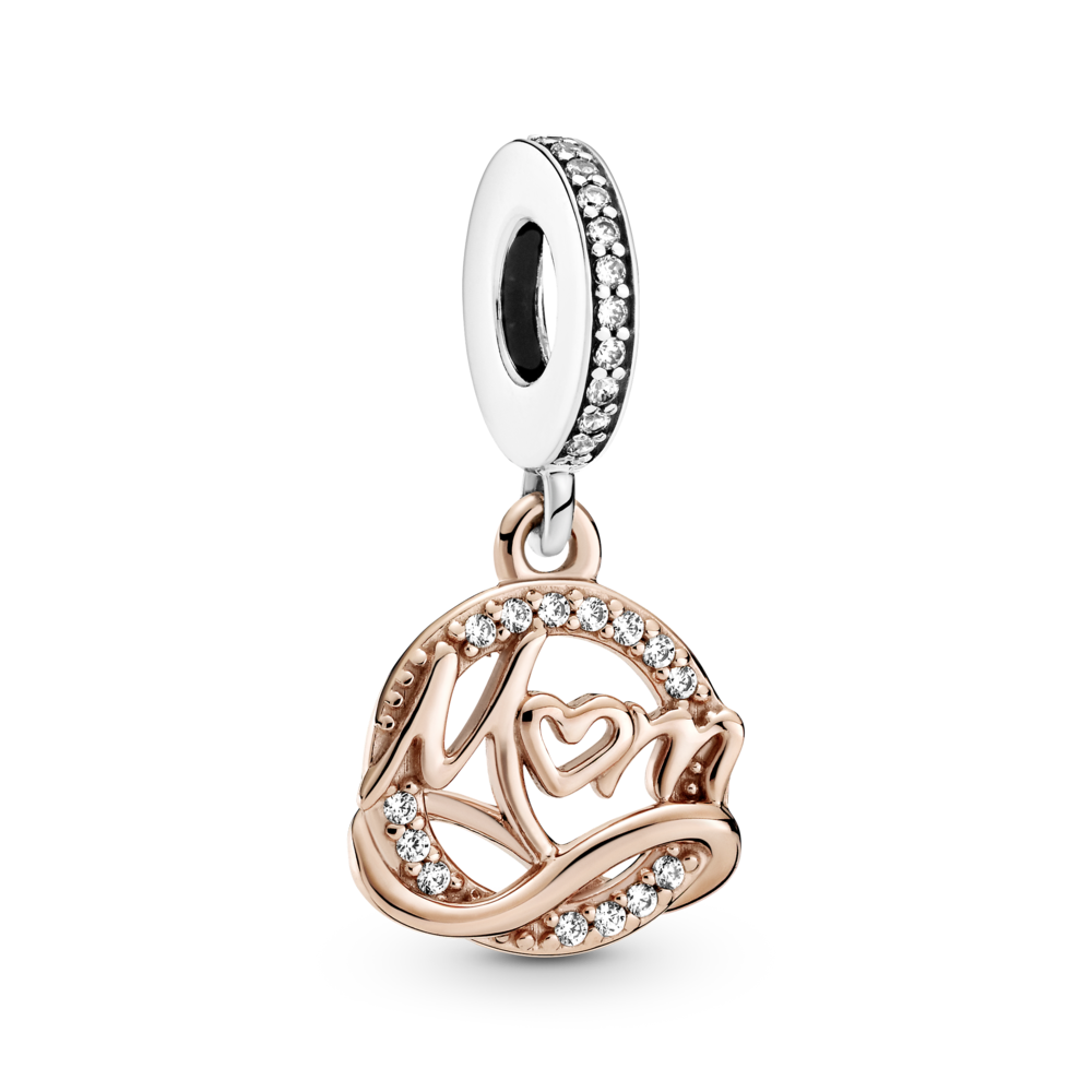 Zawieszka z motywem “Mama i nieskończoność”. Wykonana z unikalnego stopu metali Pandora Rose srebrna zawieszka z przezroczystymi cyrkoniami dookoła uchwytu i elementu ozdobnego w postaci napisu “Mom” z filigranowym serduszkiem. Symbol nierozerwalnej więzi między Mamą a dzieckiem.
