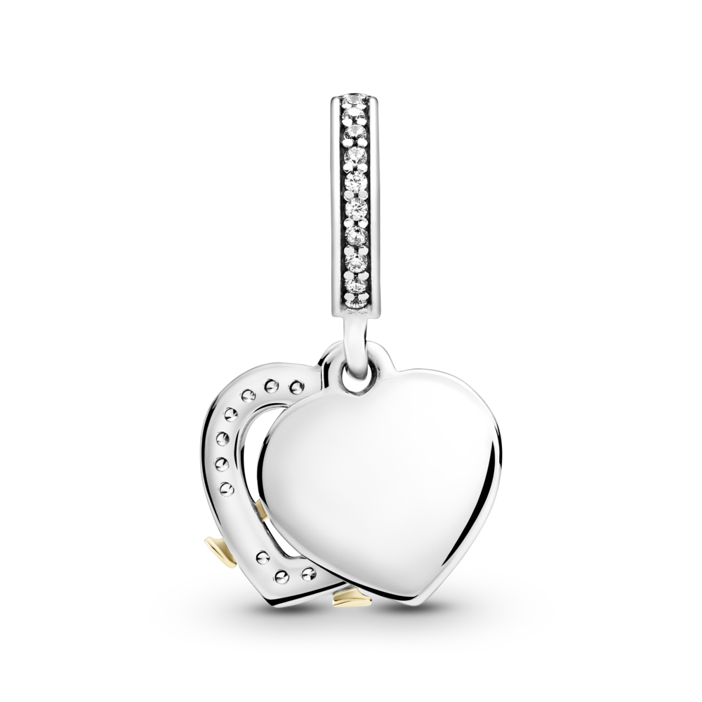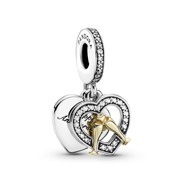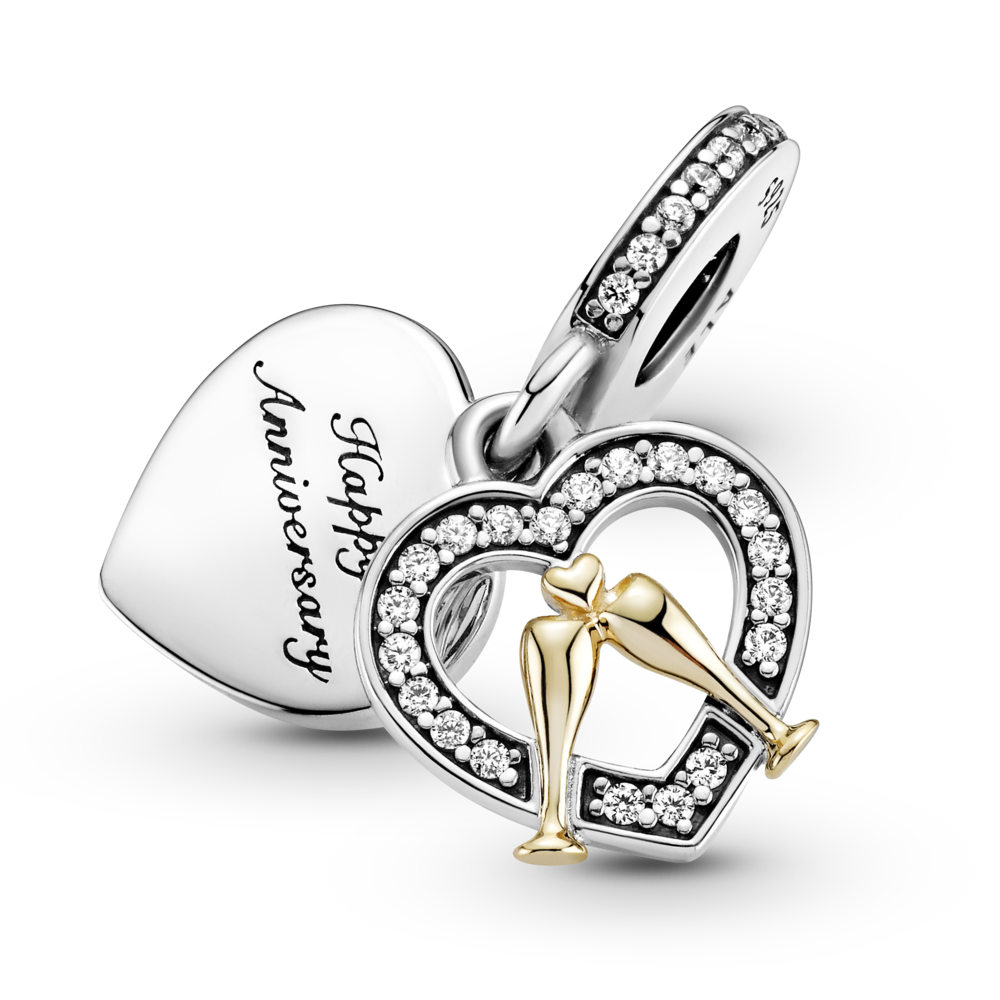 Upamiętnij miłość, która nie przemija, tą dwutonową zawieszką wykończoną ręcznie ze srebra i 14-karatowego złota. Dwa kieliszki z 14-karatowego złota wznoszą się w toaście wewnątrz serca z kamieni pavé, a rewers w kształcie serca został ozdobiony grawerunkiem „Happy Anniversary”. Uchwyt z logo Pandora i pasmem lśniących kamieni pavé. Niech ten olśniewający charms ze srebra i 14-karatowego złota będzie symbolem Waszej miłości oraz wszystkich wspólnych przeżyć – w przeszłości, teraz i w przyszłości.