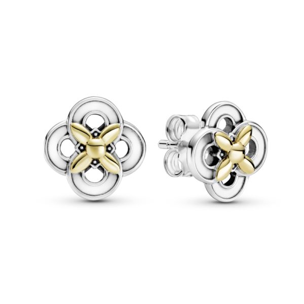 Ożyw stylizację dwutonowymi sztyftami w kształcie kwiatów. Ozdobione kwiatkami z 14-karatowego złota o uproszczonym kształcie markizy, z kulką w centrum i srebrnymi okręgami na końcach płatków, te sztyfty emanują stonowanym wyrafinowaniem. Zainspirowane klasycznymi kwiatowymi kształtami i okręgami powstającymi ze splecionych monogramów Pandora, będą słodkim, ale eleganckim akcentem każdej stylizacji – i ozdobą, po którą chce się sięgać raz za razem.