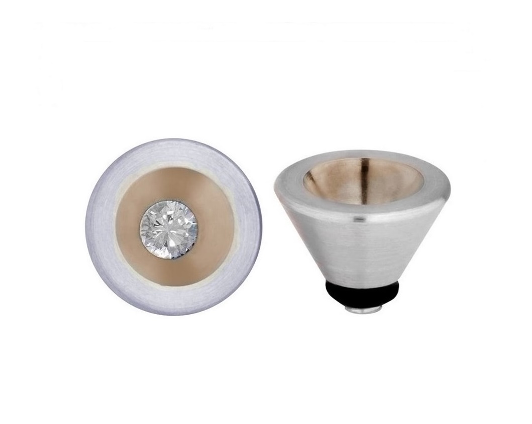Oczko wykonane z wysokiej jakości stali szlachetnej o satynowej powłoce w nowoczesnym, modernistycznym kształcie stożka z cyrkonią wewnątrz, bardzo ciekawa forma.
