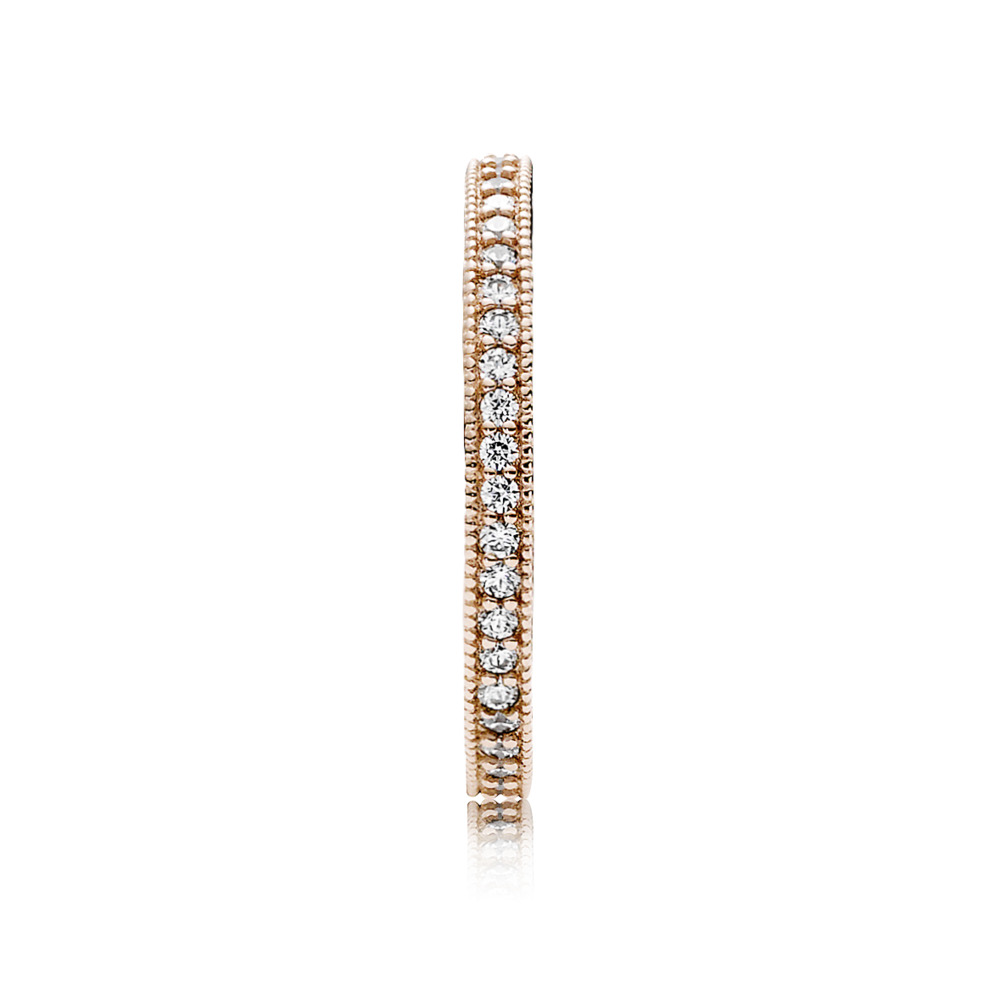 Dodaj do swojej stylizacji tą mieniącą się obrączkę. Ręcznie wykończona, delikatna obrączka wykonana z unikalnego stopu metali platerowanego 14-karatowym złotem w odcieniu Pandora Rose, połączonego z mieniącymi się cyrkoniami sześciennymi z delikatnym szlifem w kształcie serc. Świetnie wygląda sama lub w szykownym zestawie z innymi pierścionkami Pandora o różnych wykończeniach.