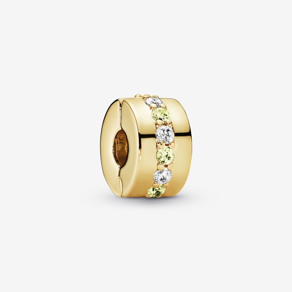 Klips platerowany 14-karatowym złotem którego piękno podkreśla środkowe pasmo przezroczystych i żółtych kamieni. Załóż go, aby charmsy nie przesuwały się na bransoletce. Klips nie ma silikonowego insertu, będzie się więc przesuwać, jeśli nie zapniesz go na gwintach (dwóch wypukłych elementach).
