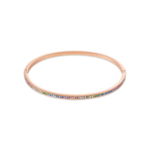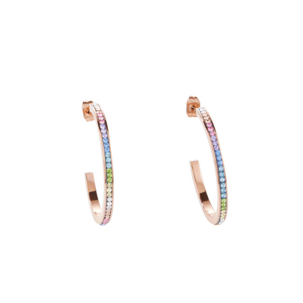 Drobne, delikatne, eleganckie koła, z pastelowymi, wielokolorowymi kryształami pavè oraz stalą szlachetną pokrywaną różowym złotem.