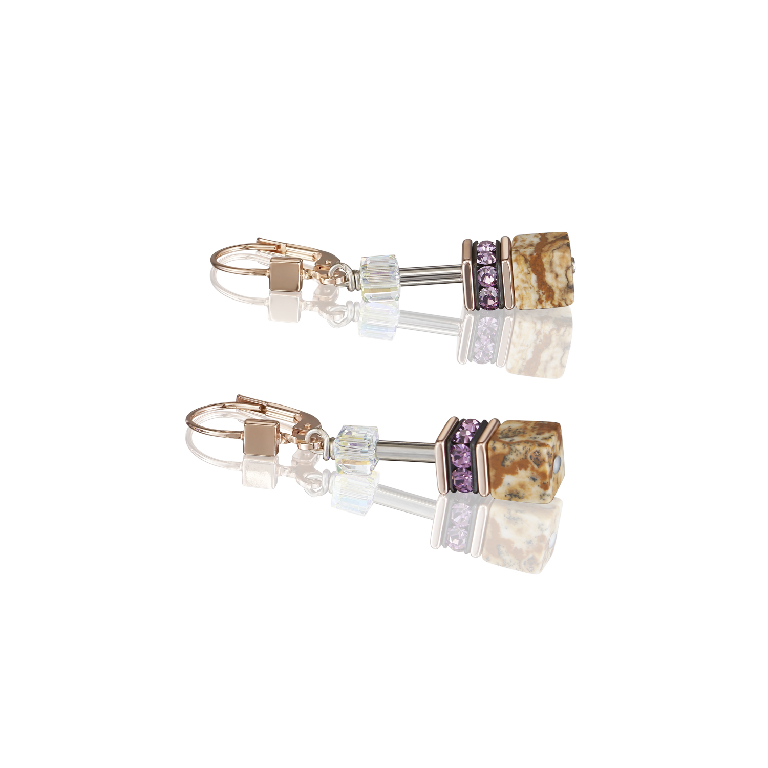 Kolczyki z kolekcji GeoCUBE®. Pełne wdzięku połączenie jaspisu krajobrazowego, kryształów Swarovski® Crystals i kryształu górskiego ze stalą szlachetną pokrywaną różowym złotem. Zapięcia wykonane z rodowanego srebra pr. 925