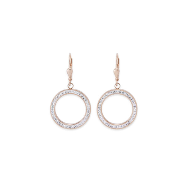 Eleganckie kolczyki z zawieszką błyszczących kryształków w oprawie pavè oraz stalą szlachetną pokrywaną różowym złotem.